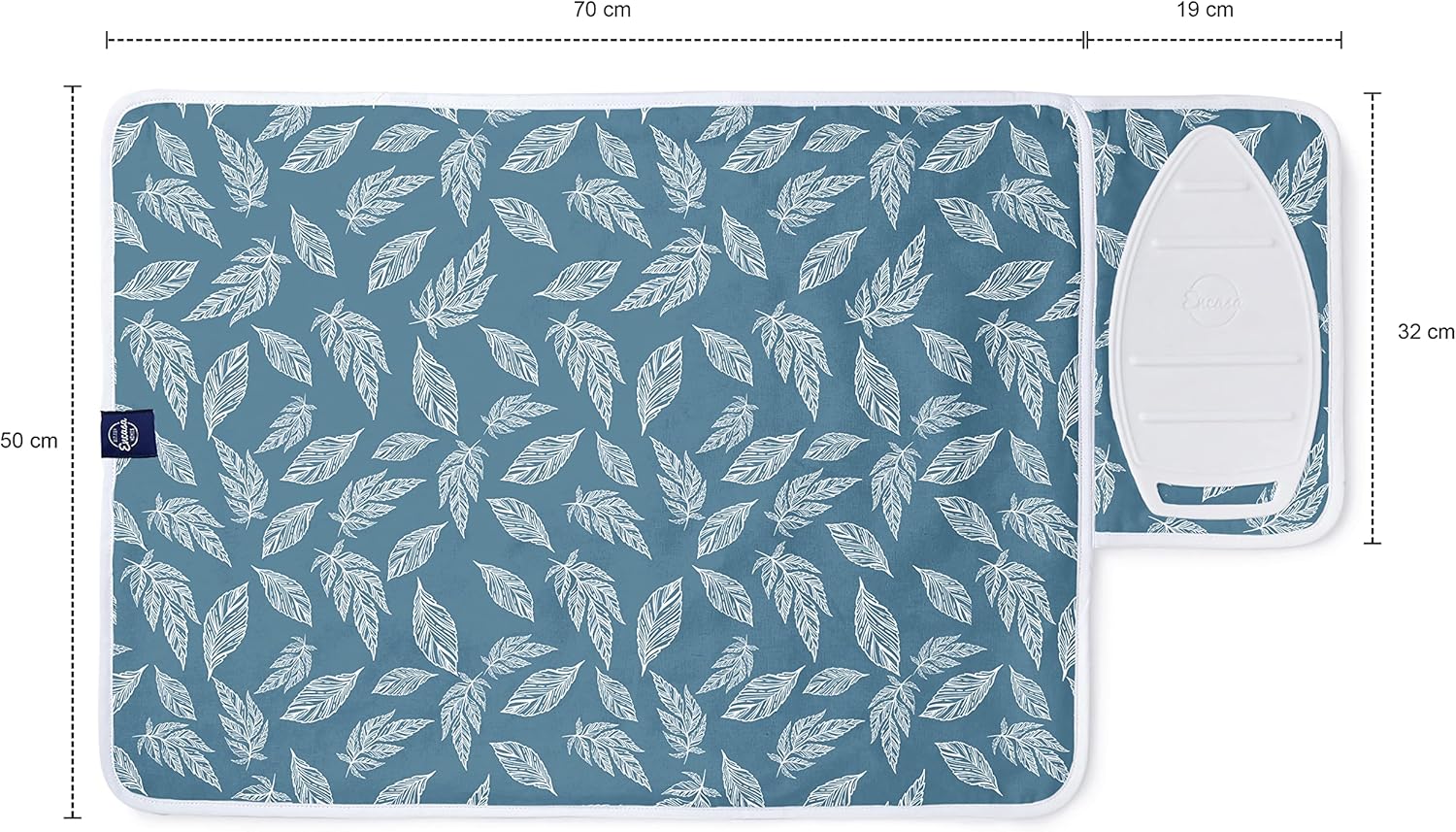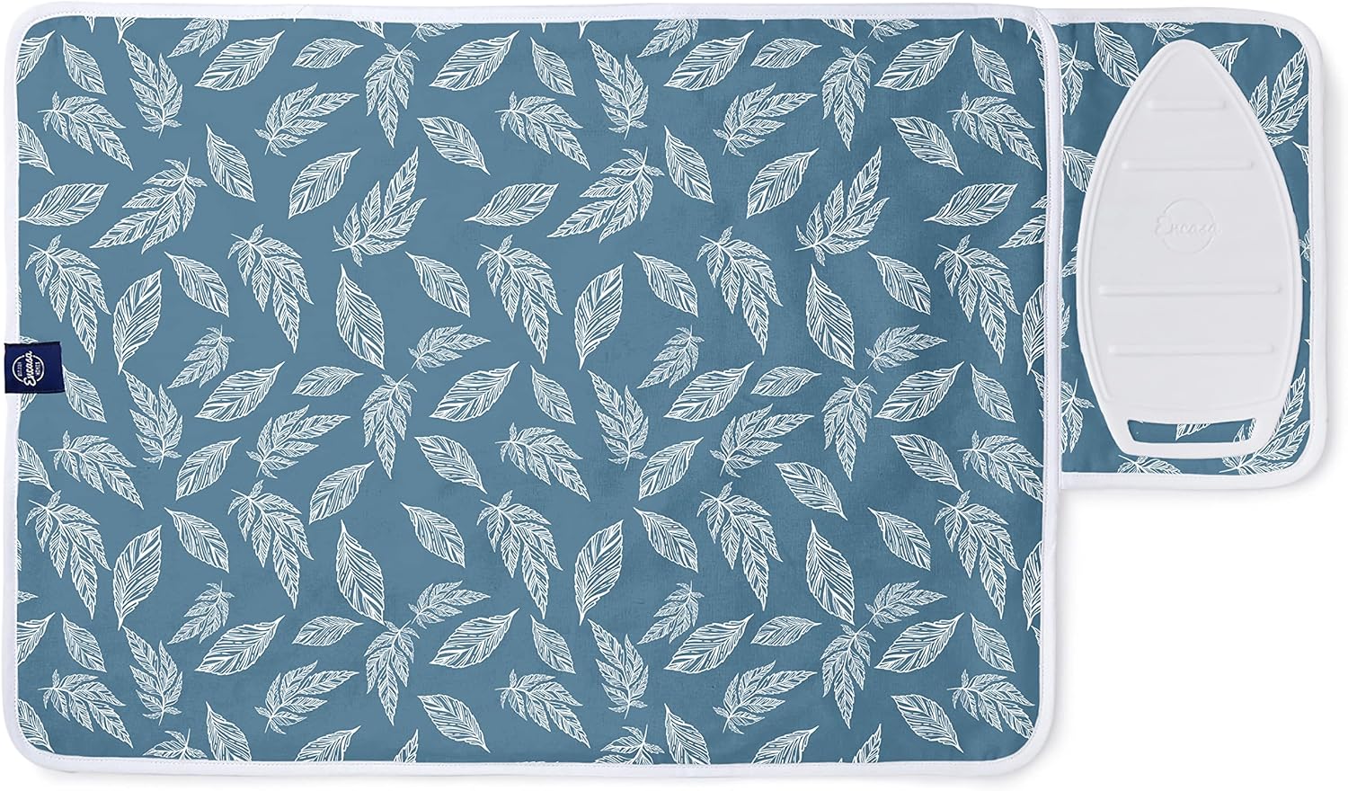 Encasa XO Ironing Mat/Pad (Small 28"x20") with 3mm Padding & Silicone Iron Rest for Steam Pressing on Tabletop or Bed - Heat Resistant, Portable, Quilting & Travel Blanket - Big Leaves Blue