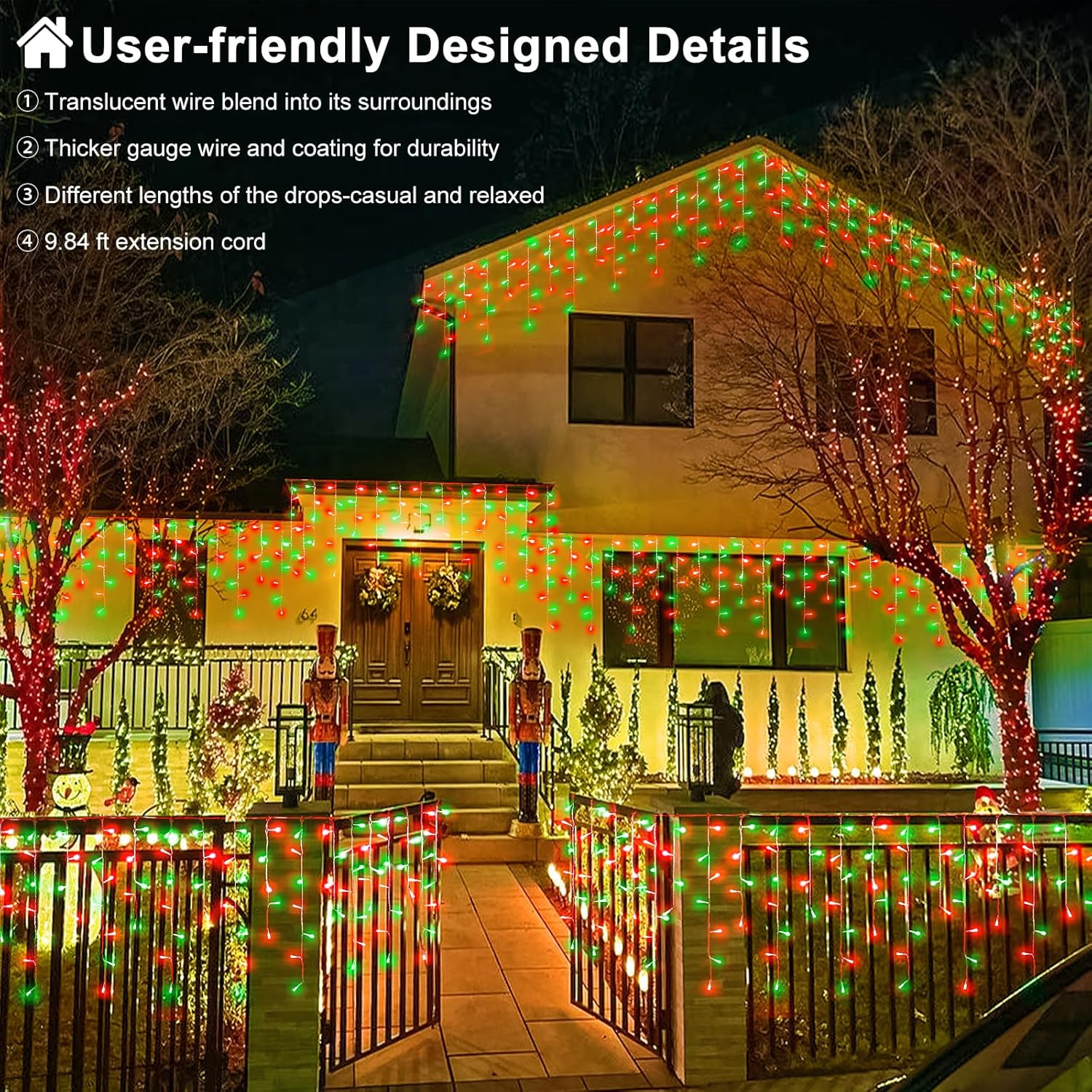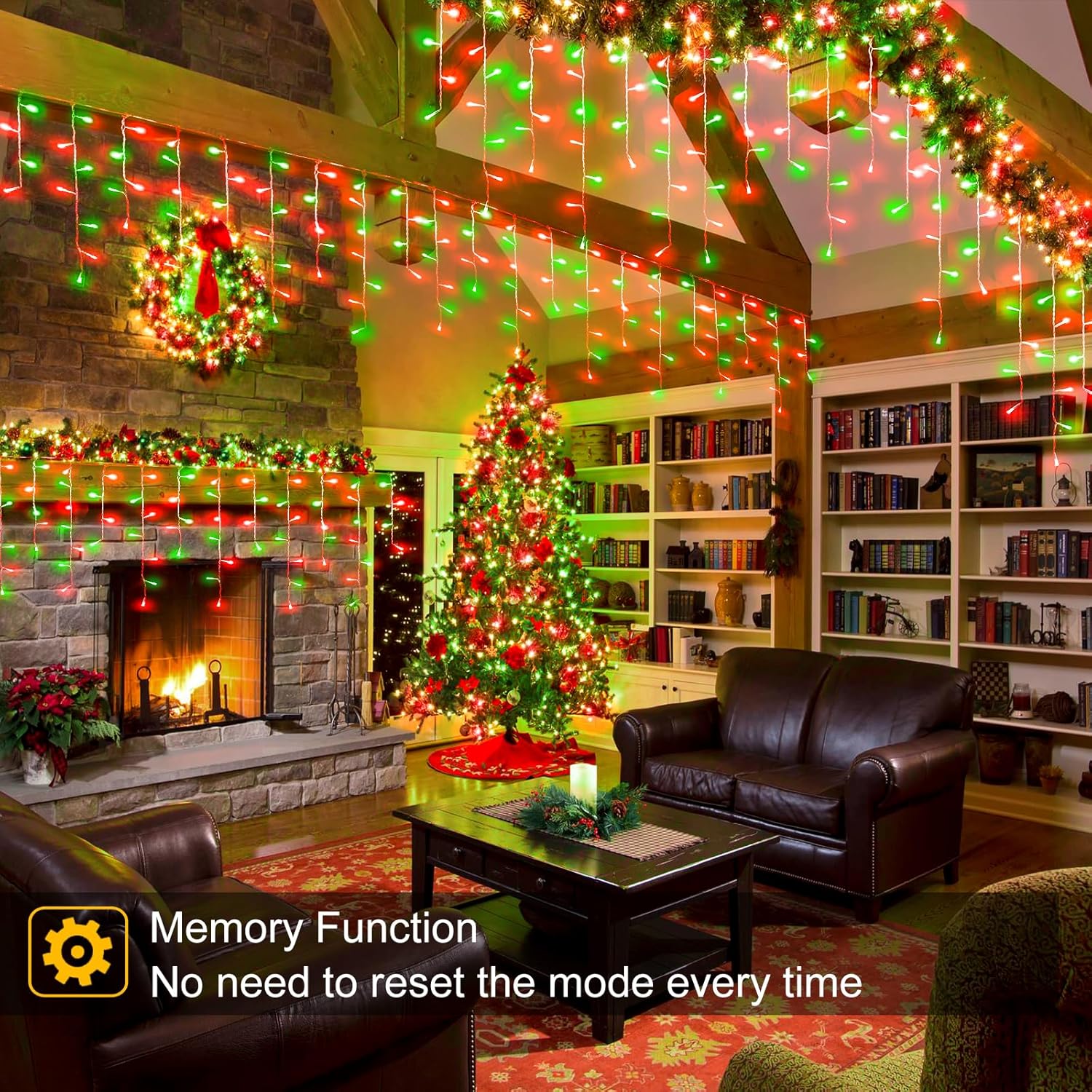 • Upgraded 8 Modes Red and Green Christmas Lights: The icicle Lights for outside have 8 selections of light pattern: 1.Combination 2.In Waves 3.Sequential 4.Slo-Glo 5.Chasing/Flash 6.Slow Fade 7.Twinkle/Flash 8.Steady On. Different lighting effects are controlled by the button on the plug. These beautiful and vibrant Christmas lights outdoor will bring you a lot of festive atmosphere.