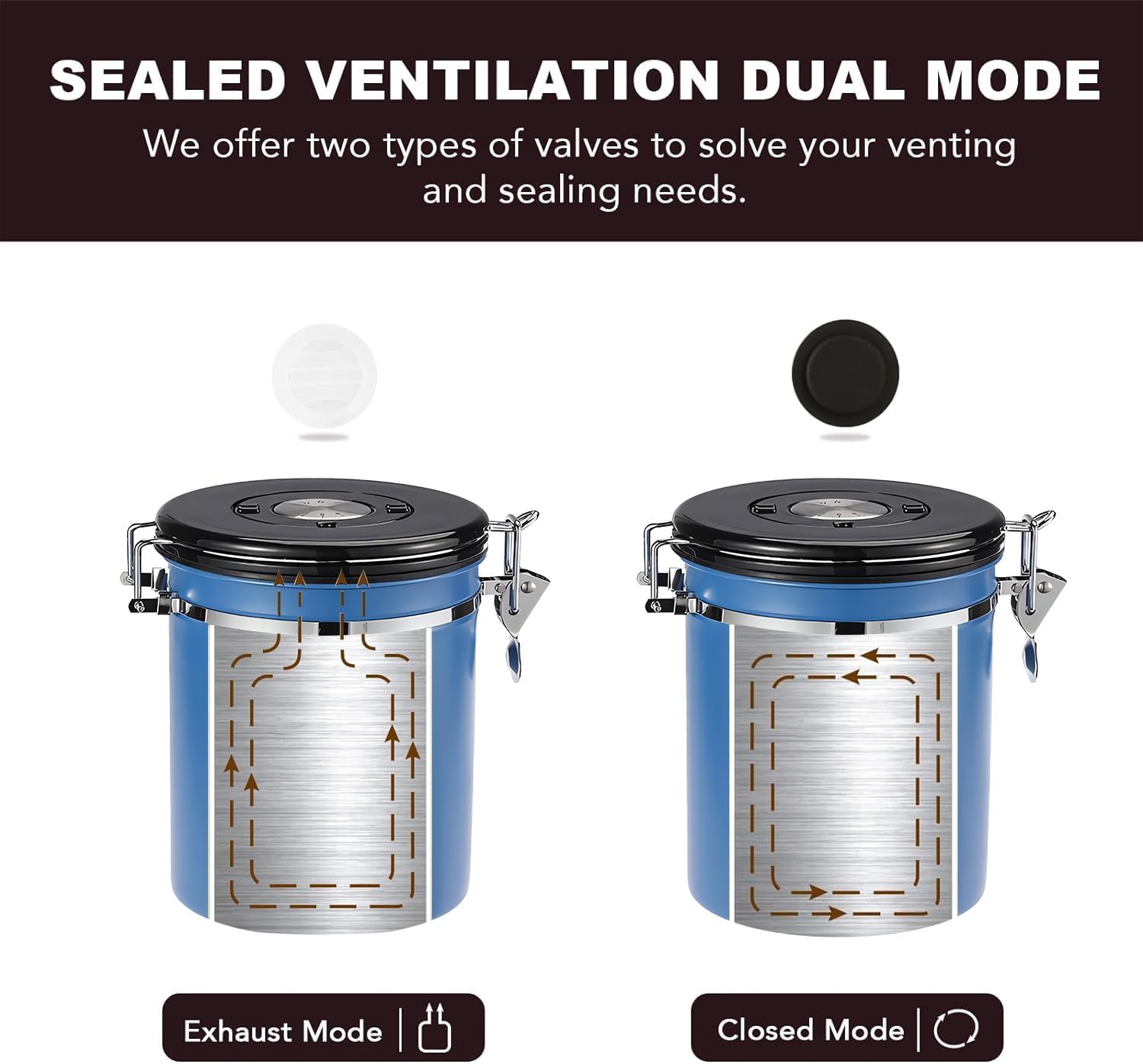 • 【TWO EXHAUST MODES】The canister features a CO₂ valve system and a silicone seal to lock in freshness and keep out moisture and air. A silicone gasket around the edge of the lid ensures an airtight seal when the lid is closed. Storing your coffee beans in this well-designed canister helps extend their freshness and ensures that every cup, even weeks later, tastes as good as the first.