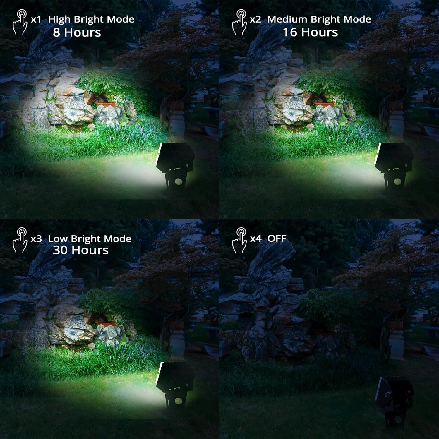 • 【Auto ON/OFF and Dusk to Dawn】The Solar Landscape Light comes with separate solar panel, the cable from solar panel to the first spotlight is 16.4ft, can install the solar panel where can absorb max sunshine. The garden light will turn on in the night and turn off in daytime automatically. 3 power modes(High/Mid/Low) can meet different usage requirements. Large capacity battery ensures the light can work from Dusk to Dawn when battery is fully charged.