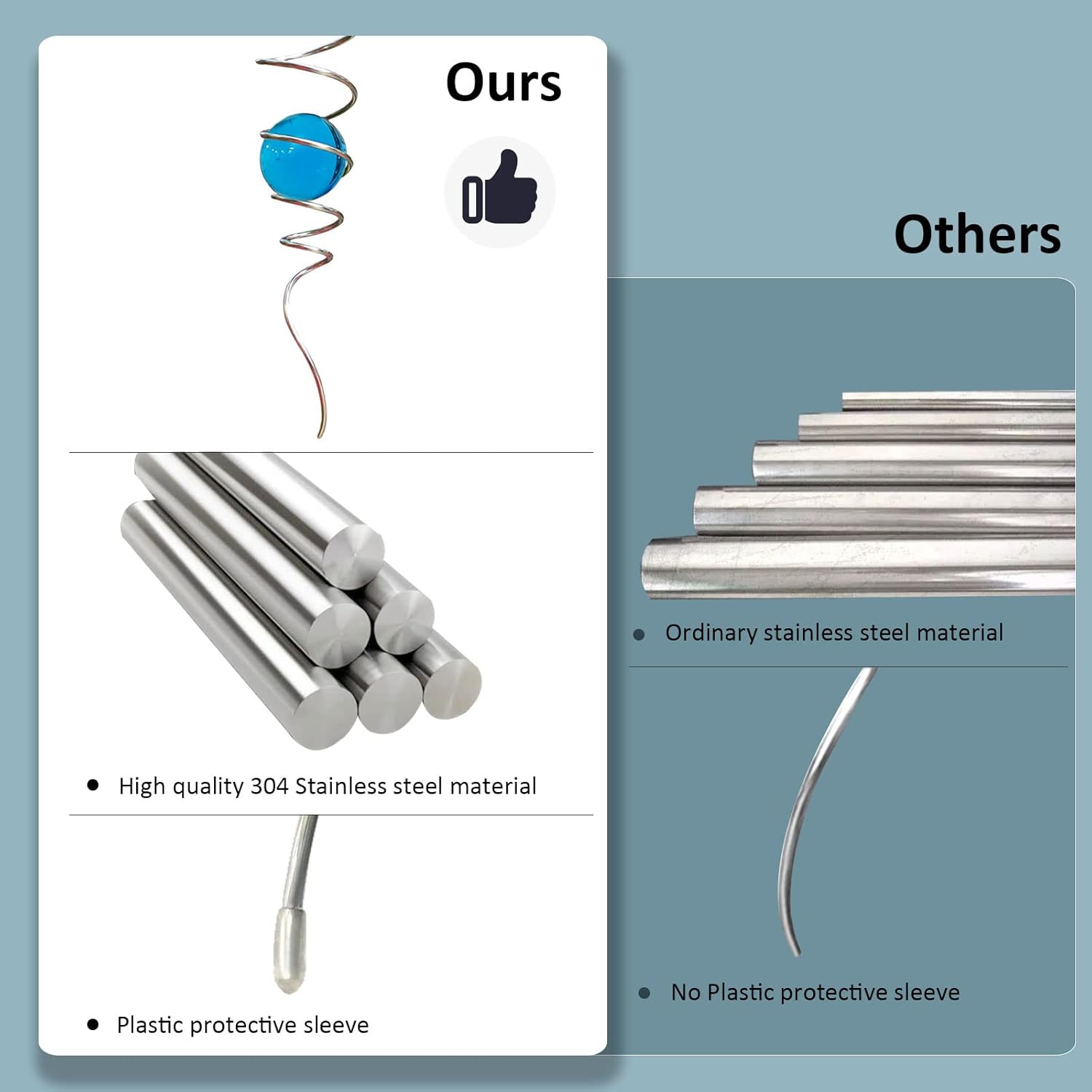 • 【High Quality Gazing Ball Spiral Tail 】This wind spinner spiral tail is made of 304 stainless steel wire,the blue gazing ball made of solid glass ball of solid color glass material,have good weather resistant,no fading under sunshine.Better quality than iron material with nickle plating and painting color glass ball in the market. Unlike others spiral tail,our wind spinner stabilizer is also equipped with a plastic protective sleeve at the tail.