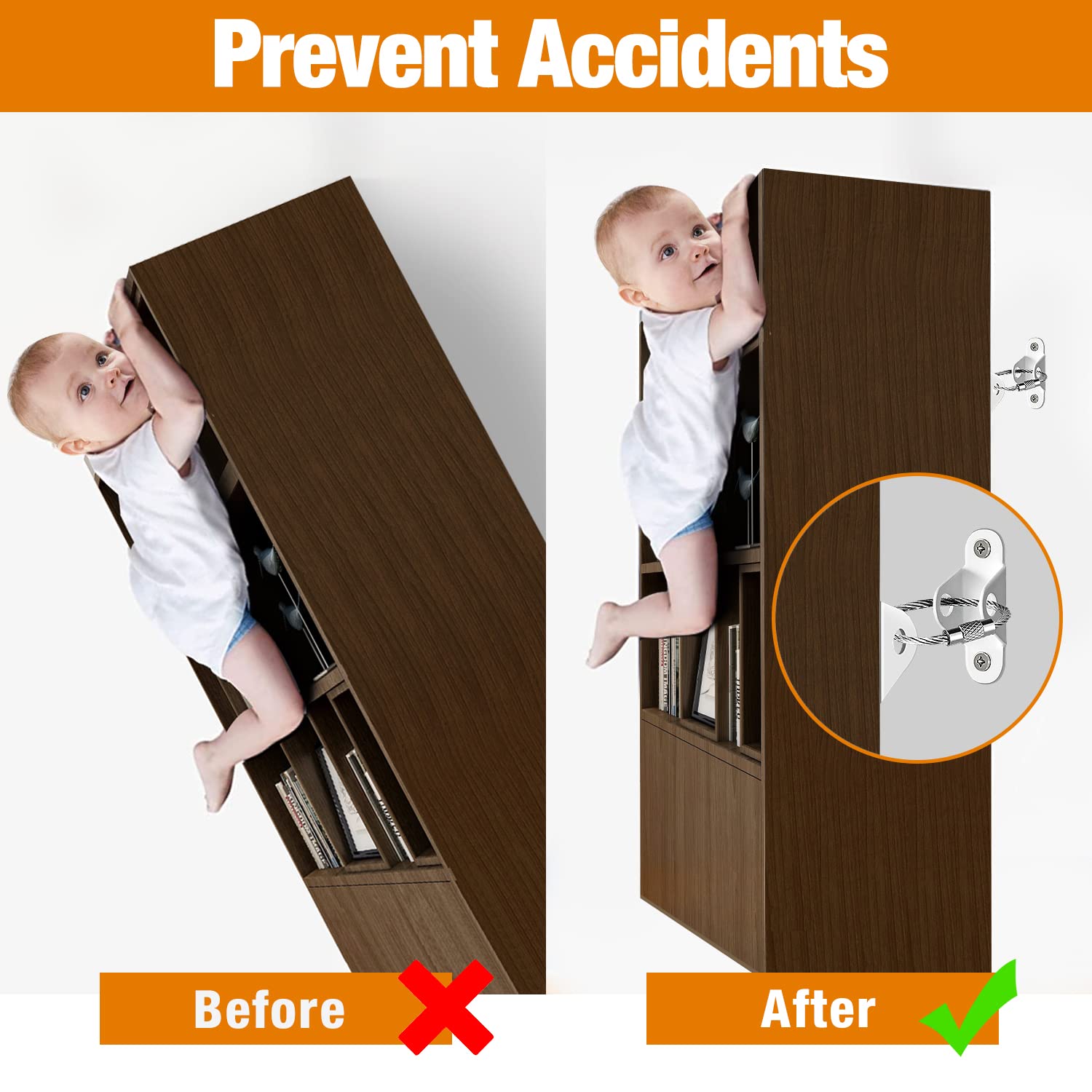 • Baby Safety Guard: Let your little one explore and climb to their heart's content! Baby proof furniture anchors help keep furniture secure from the potential tip-over hazard of curious children. This anchor will help keep furniture upright even if your children pull out the dresser drawer to form a ladder and climb onto the dresser for fun.