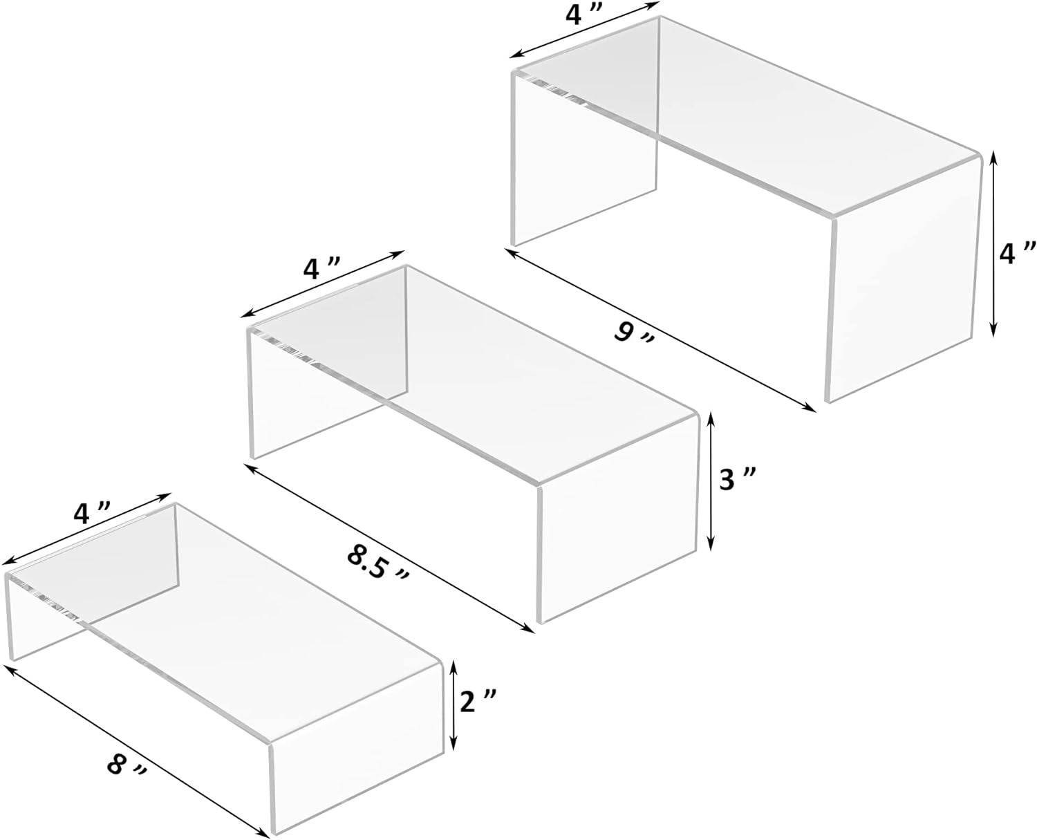 Clear Riser Shelf 3pcs, Desktop Rectangular Acrylic Display Shelves Organizer, Acrylic Stands for Funko Pop Figure, Perfumes, Bags, Shoes, Glasses, Plants, Toys, Collectibles - 8''x8.5''x9''