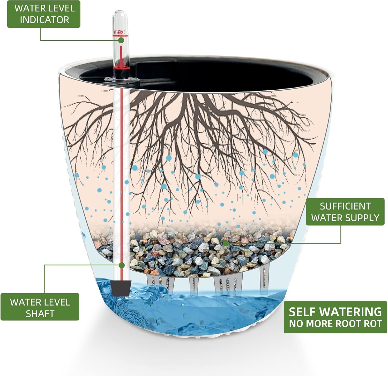 • SELF WATERING & NO MORE ROOT ROT - The smart unique sub-irrigation system is one of the most appealing aspects among all Dexceder planters. The easy-to-use separated integrated water reservoir or catcher- keeps your soil well aerated and automatic supplies plants with the right amount of ongoing moist air & nutrition for optimal growth. The insert indicator shows you the exact time to water again. The full water supply period can single-handedly last over 3 weeks based on different live plants
