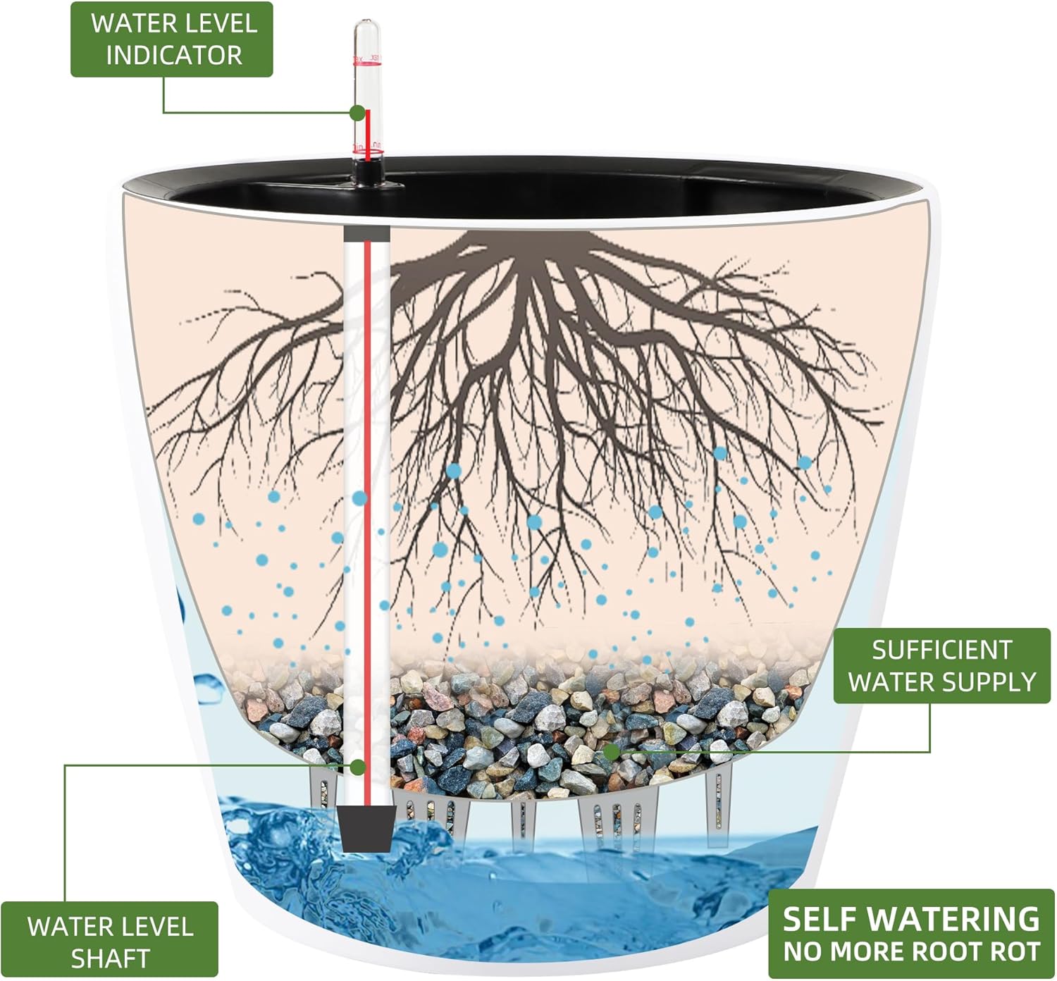• SELF WATERING & NO MORE ROOT ROT - The smart unique sub-irrigation system is one of the most appealing aspects among all Dexceder planters. The easy-to-use separated integrated water reservoir or catcher- keeps your soil well aerated and automatic supplies plants with the right amount of ongoing moist air & nutrition for optimal growth. The insert indicator shows you the exact time to water again. The full water supply period can single-handedly last over 3 weeks based on different live plants