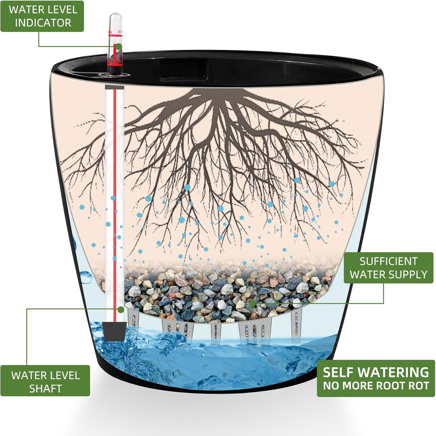 • Drainage and Spillway: The drainage plug and spillway prevent overwatering and underwatering.