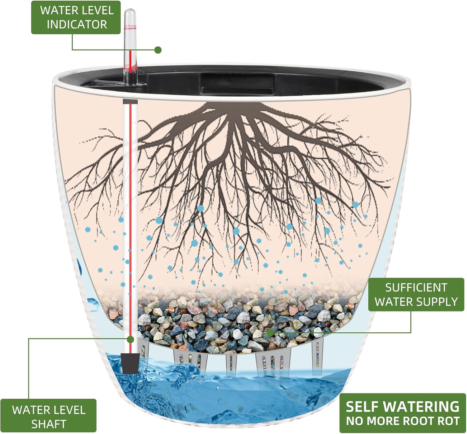 • Self-Watering System: The integrated water reservoir keeps soil moist and aerated, with an indicator to signal when to water again.