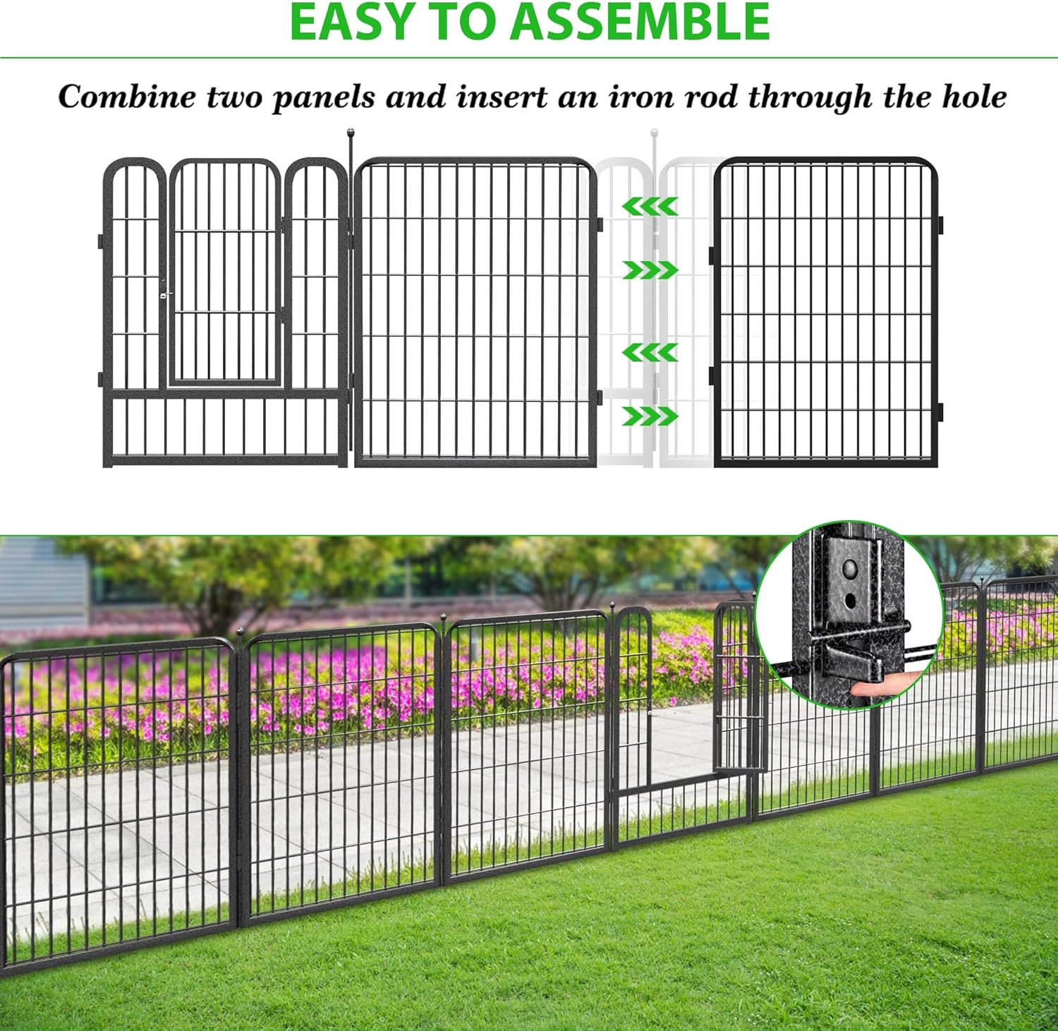 • Easy to Assemble: Our decorative fence panels outdoor is easy to assemble by combining two panels and inserting the rod through the hole. The metal fencing for yard can be fold down in minutes for easy storage and transportation. It can be expanded for longer size by adding more fences