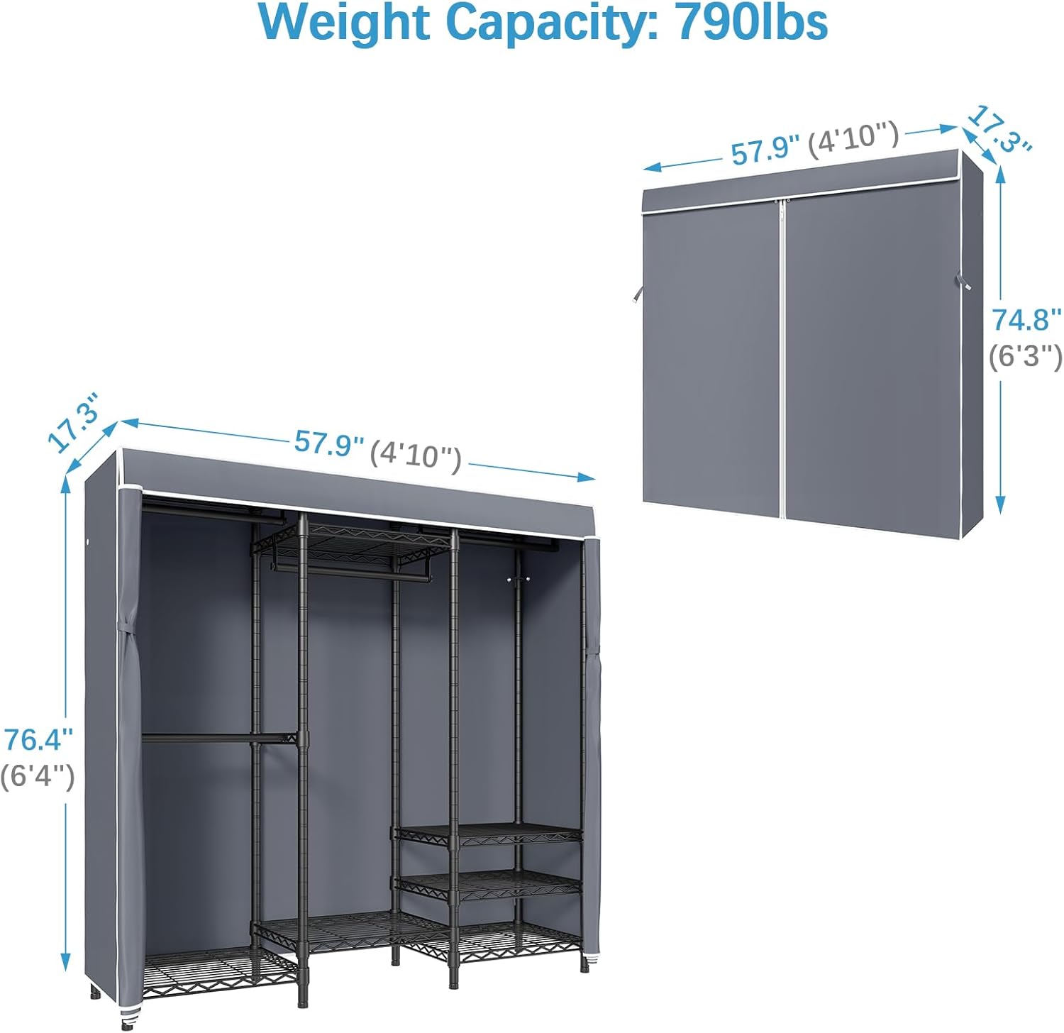 • Dimensions & Load Capacity: 57.9" L x 17.3" W x 76.4" H (includes cover). Load capacity up to 790 lbs. Single hanging rod can support up to 60 lbs, Wire shelf can support up to 88 lbs for each.