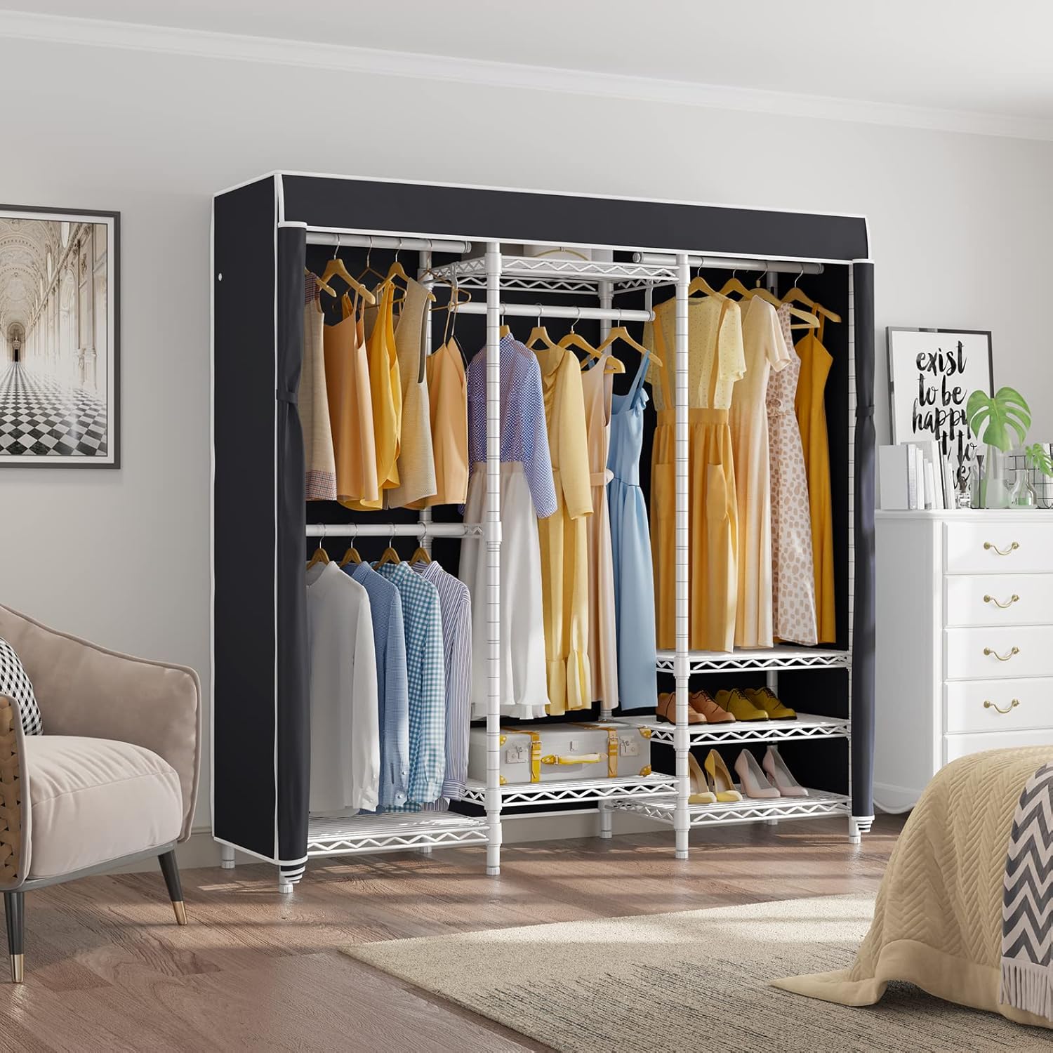 • Sturdy & Enduring: Made of premium iron, this clothes rack delivers stability, durability, and endurance. Featuring powder-coated metal components, it's protected against water and rust, guaranteeing enduring quality.