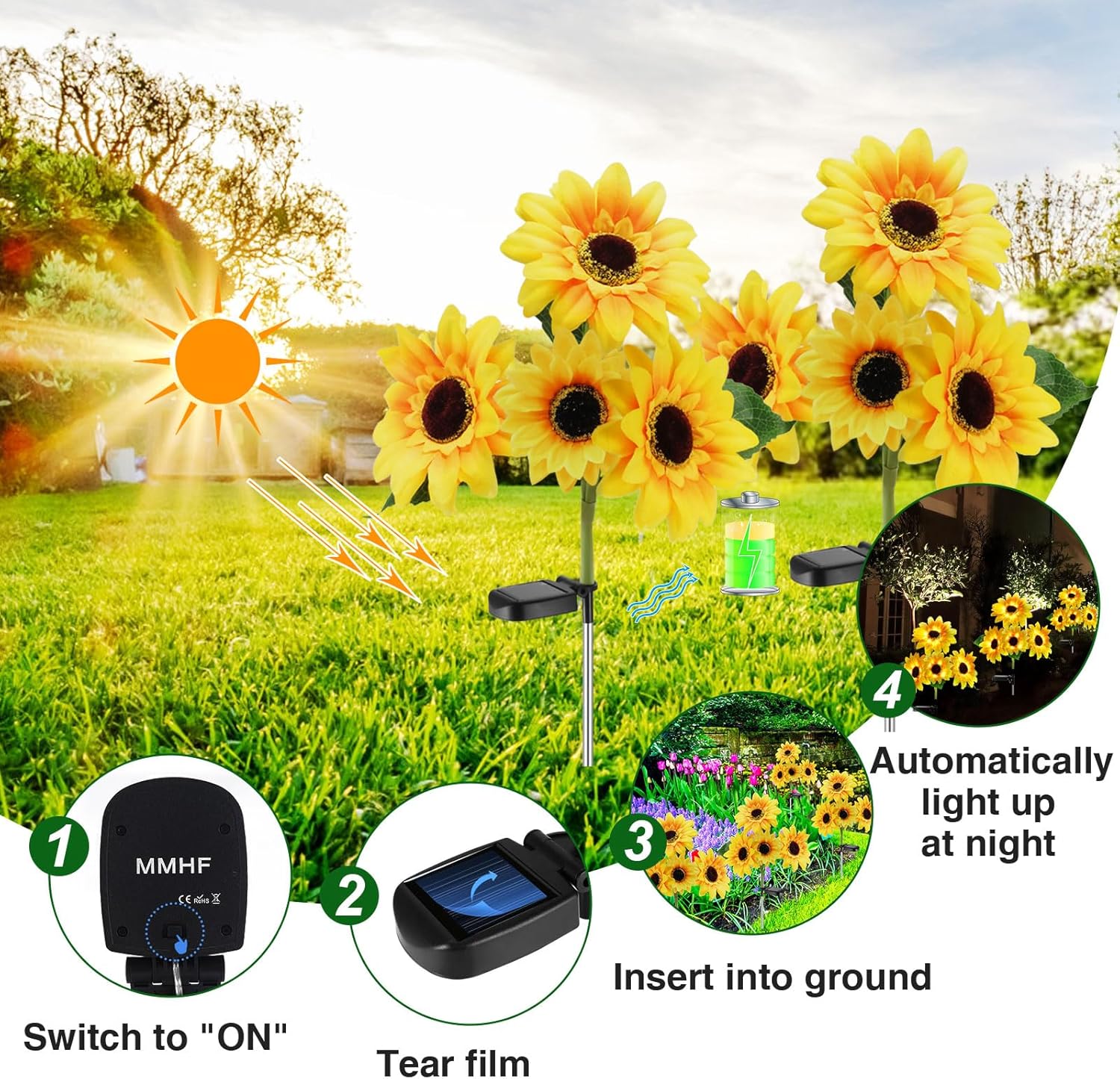 • 【Brightness & Beautiful】3 in 1 solar decorative sunflower light, 24 LED bulbs will turn on automatically at night! MMHF solar sunflower lights outdoor is beautiful enough to create a romantic atmosphere. Make your garden unique!