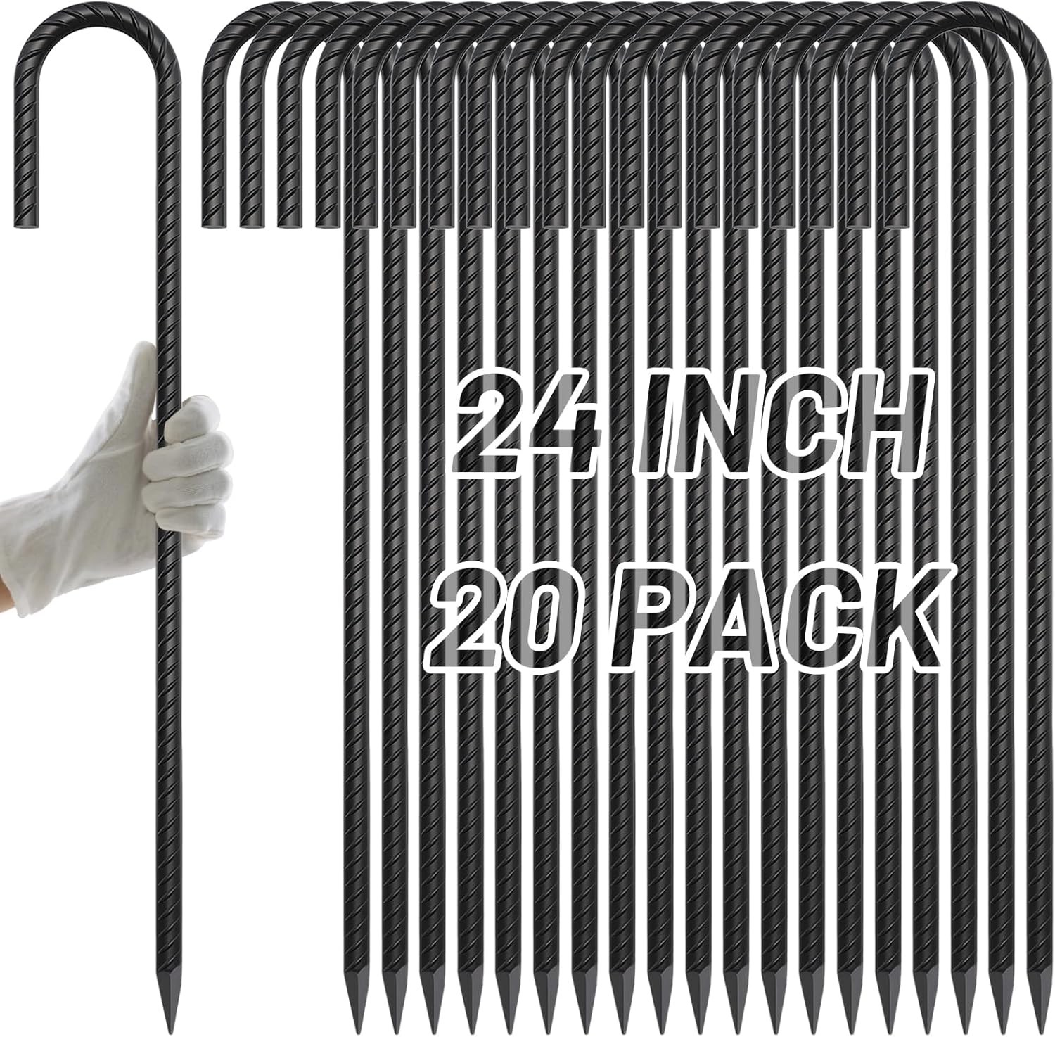 AAGUT 24Inch Rebar Stakes 20Pcs Heavy Duty 1/2 Inch J Hook Fence Anchors Curved Steel Garden Stake Yard Spikes with Sharp End for Camping Tent,Black Powder Coated