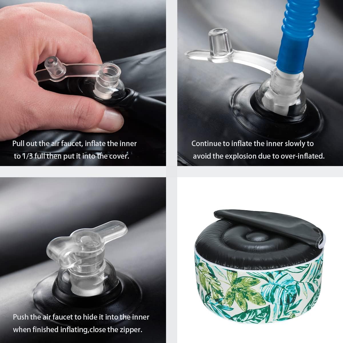 • 【Durable Outdoor Material】-Inflatable ottoman cover made from durable, waterproof material that can withstand exposure to all weather. Fade-Resistant keep its original color and pattern even if exposed to the direct sunlight for over 500 hours. The black inner made of waterproof thick PVC fabric that can bear up 300 lbs.Very easy to clean and maintain.