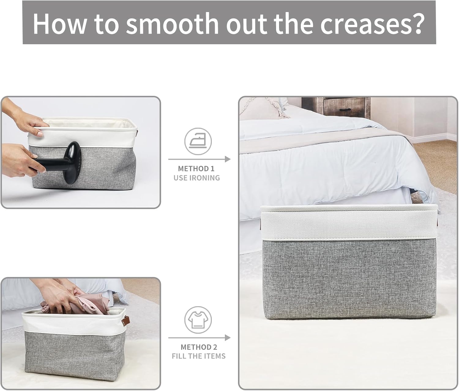 • 【Maintenance & Care Tip】 - Collapsible design for space saving. Our foldable baskets comes in a compression packing which may result in wrinkled storage bin during the long transit. Get rid of the wrinkles by either stuffing the fabric storage bins with blankets and pillows for a few days or steam iron them at low-heat setting. The organization baskets are easy to clean, you can dust the basket with a soft cloth with light soapy water when needed. Not recommended to machine wash.
