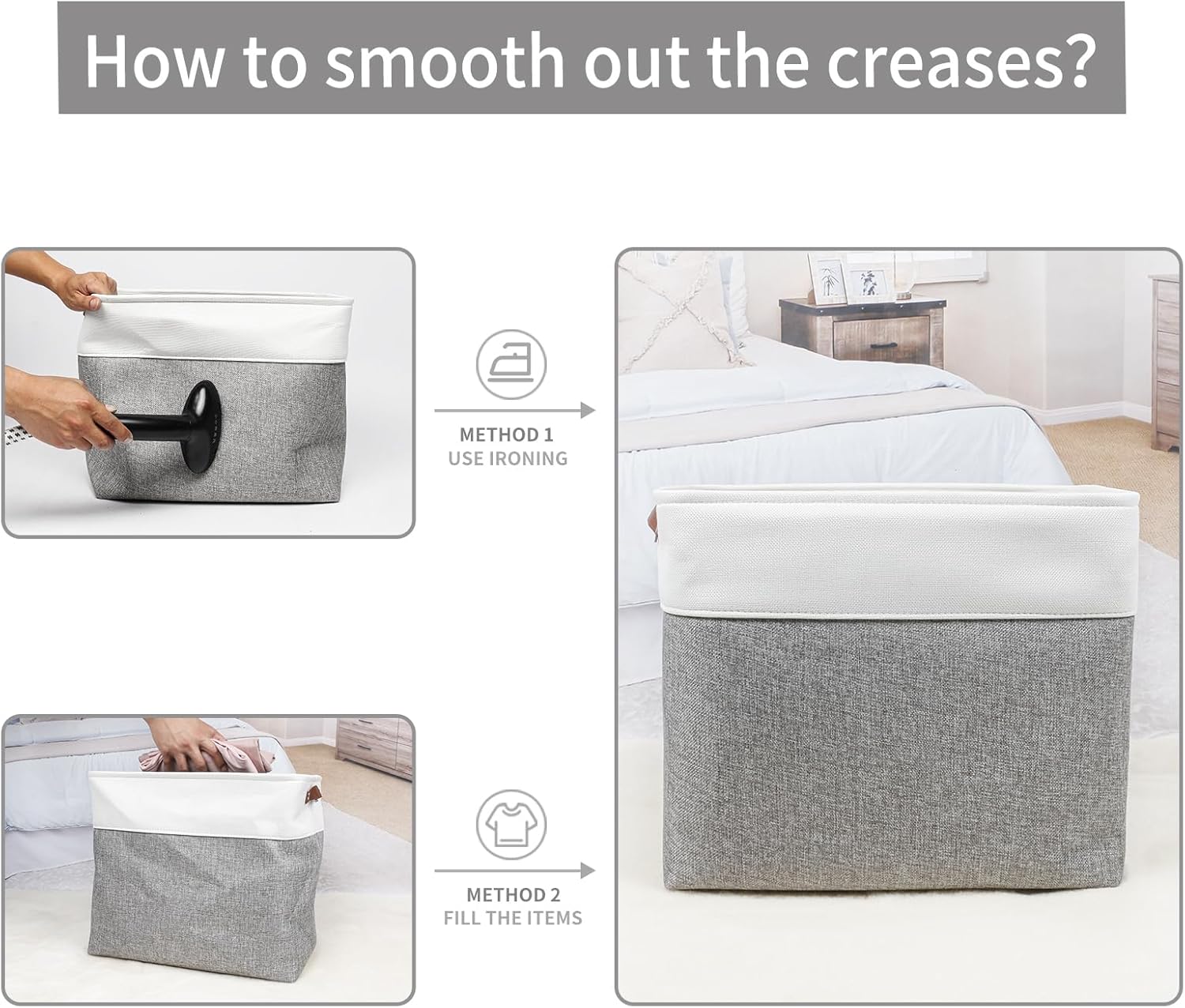 • 【Maintenance & Care Tip】 - Collapsible design for space saving. Our foldable baskets comes in a compression packing which may result in wrinkled storage bin during the long transit. Get rid of the wrinkles by either stuffing the fabric storage bins with blankets and pillows for a few days or steam iron them at low-heat setting. The organization baskets are easy to clean, you can dust the basket with a soft cloth with light soapy water when needed.