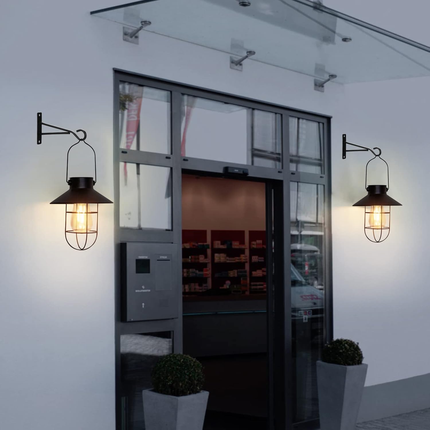 pearlstar Solar Lanterns Outdoor Metal Solar Powered Hanging Lights Waterproof for Wall Yard Garden Patio Garage Balcony Porch Fence Decor, Warm White Edison Bulb,with Wall Mount Kit(Black-1pack)