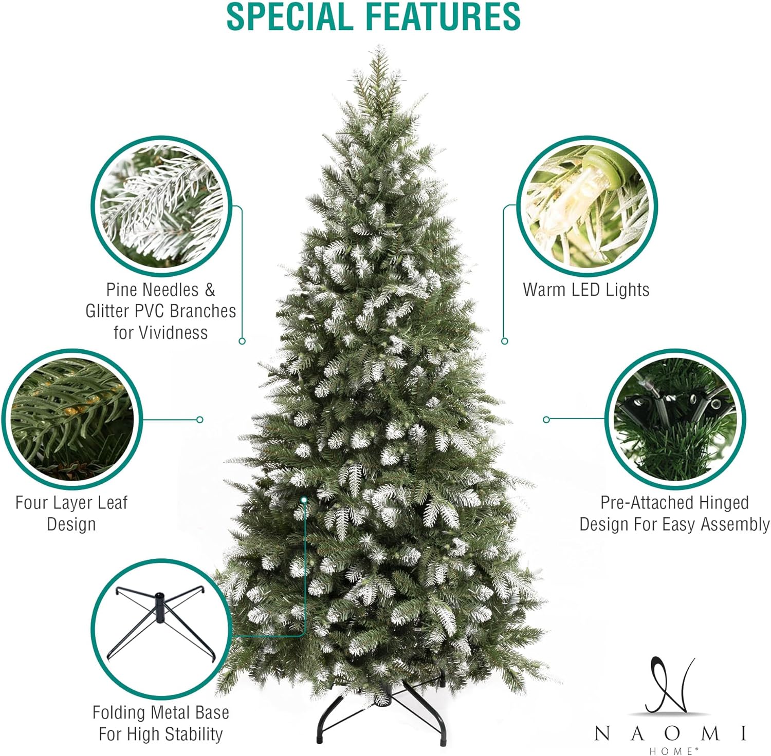 Naomi Home 7.5ft White Tip Christmas Tree with Lights, Realistic Light Snow Flocked Fir Prelit with 1746 Branch Tips, 550 Warm Lights and Metal Stand, Aritificial Tree