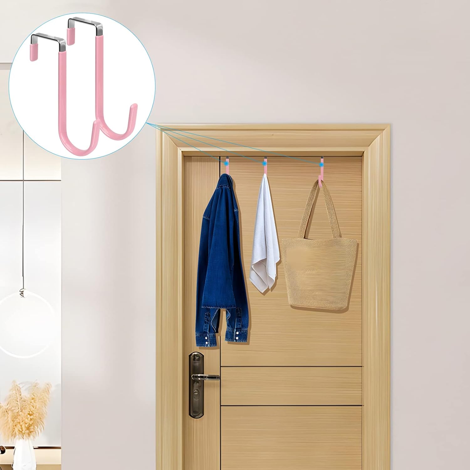 FYY Over The Door Hooks, 4 Pack Door Hangers Hooks with Rubber Prevent Scratches Heavy Duty Organizer Hooks for Living Room, Bathroom, Bedroom Hanging Clothes, Towels, Hats, Coats, Bags Pink