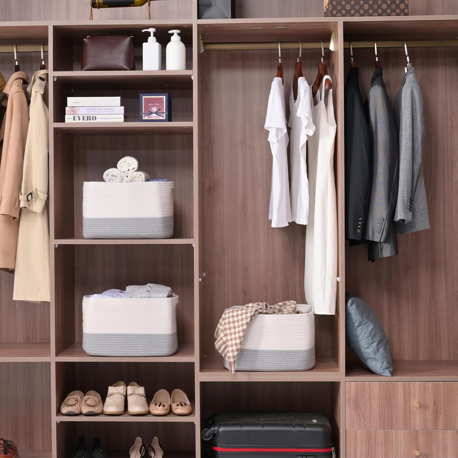 Storage Baskets for Organizing Shelves, Woven Cotton Rope Bins for Baby Nursery Organization, Book Toy Towel Organizer, 15"x11"x9.5", 3 Packs, Off White & Grey