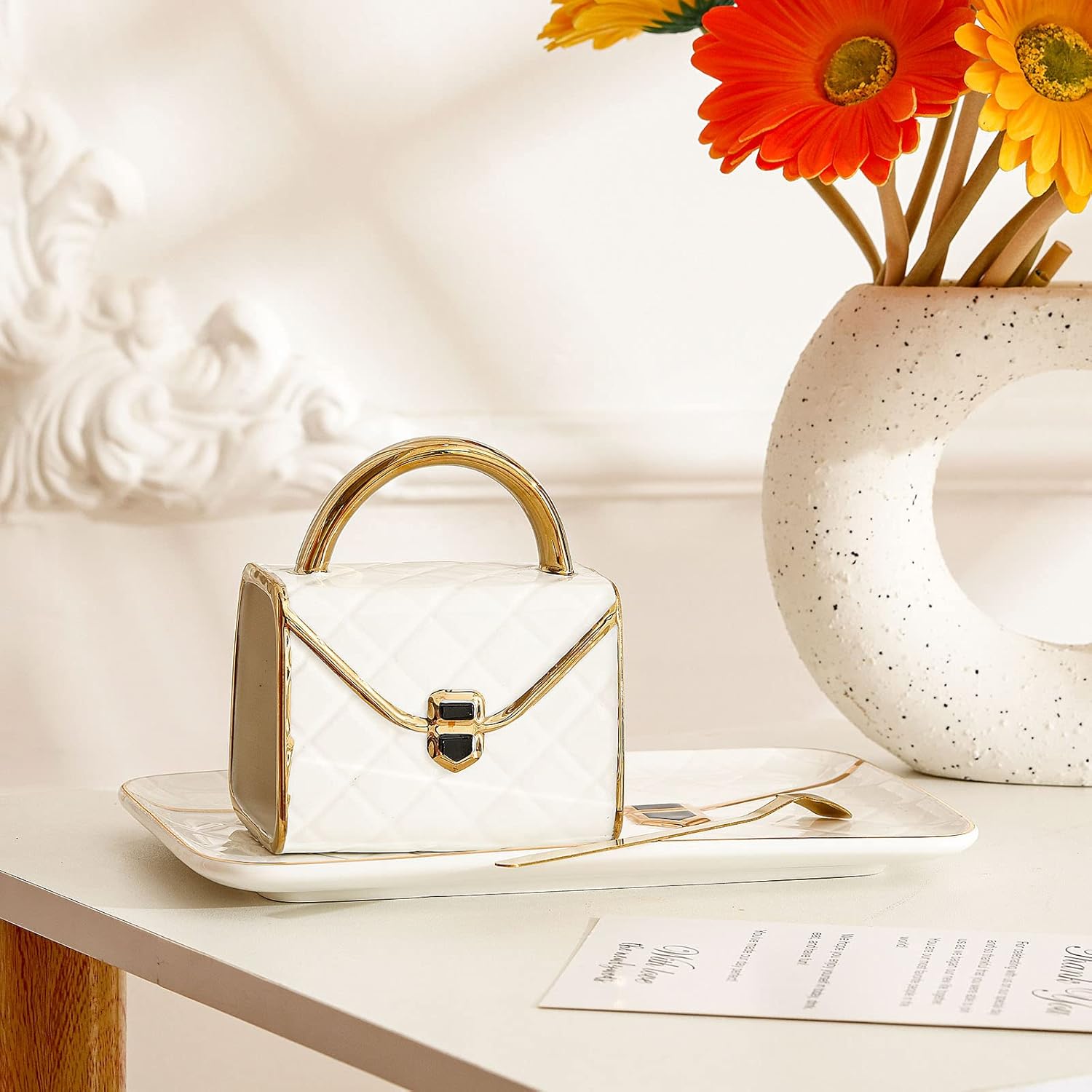 Zubebe 1 Set Coffee Mug Elegant Handbag Shaped Cup Modern Ceramic Purse Mug with Spoon and Saucer, 10oz Cute Creative Tea Cup for Office Home Woman Girls Gift (White)