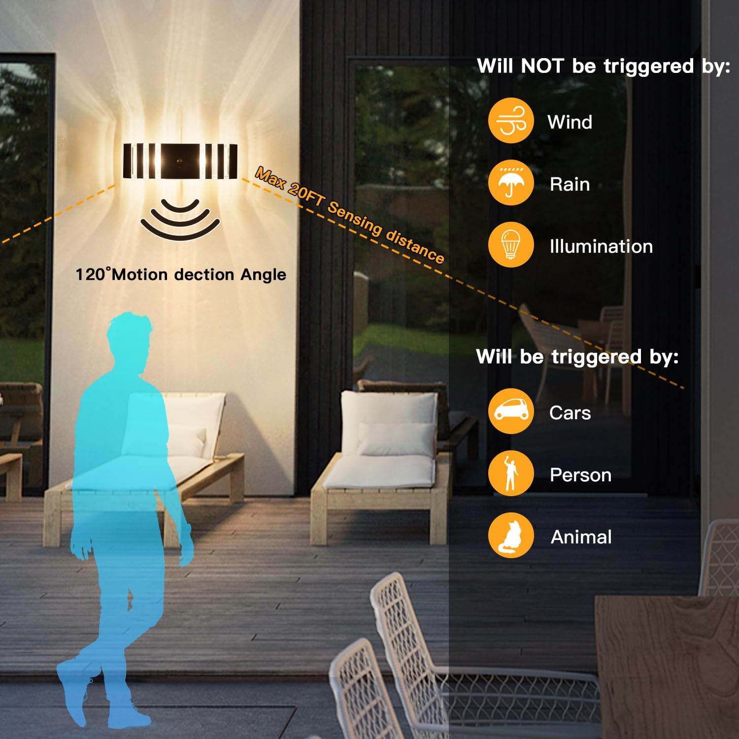 • ❗❗❗【Upgraded Motion Sensor】These motion sensor outdoor light combining the advanced PIR motion sensor & IC light sensor. Featuring with dusk to dawn function, these motion sensor lights will auto turn on at dusk and off at dawn. Furthermore, with upgraded motion sensor, the outdoor motion sensor light will auto light up your space with full brightness when motion detected at night.(Activation at dusk does not cause it to light up, it only causes it to activate the sensing function, this product will only light up at 100% brightness at night and when motion is detected and both conditions are met.)
