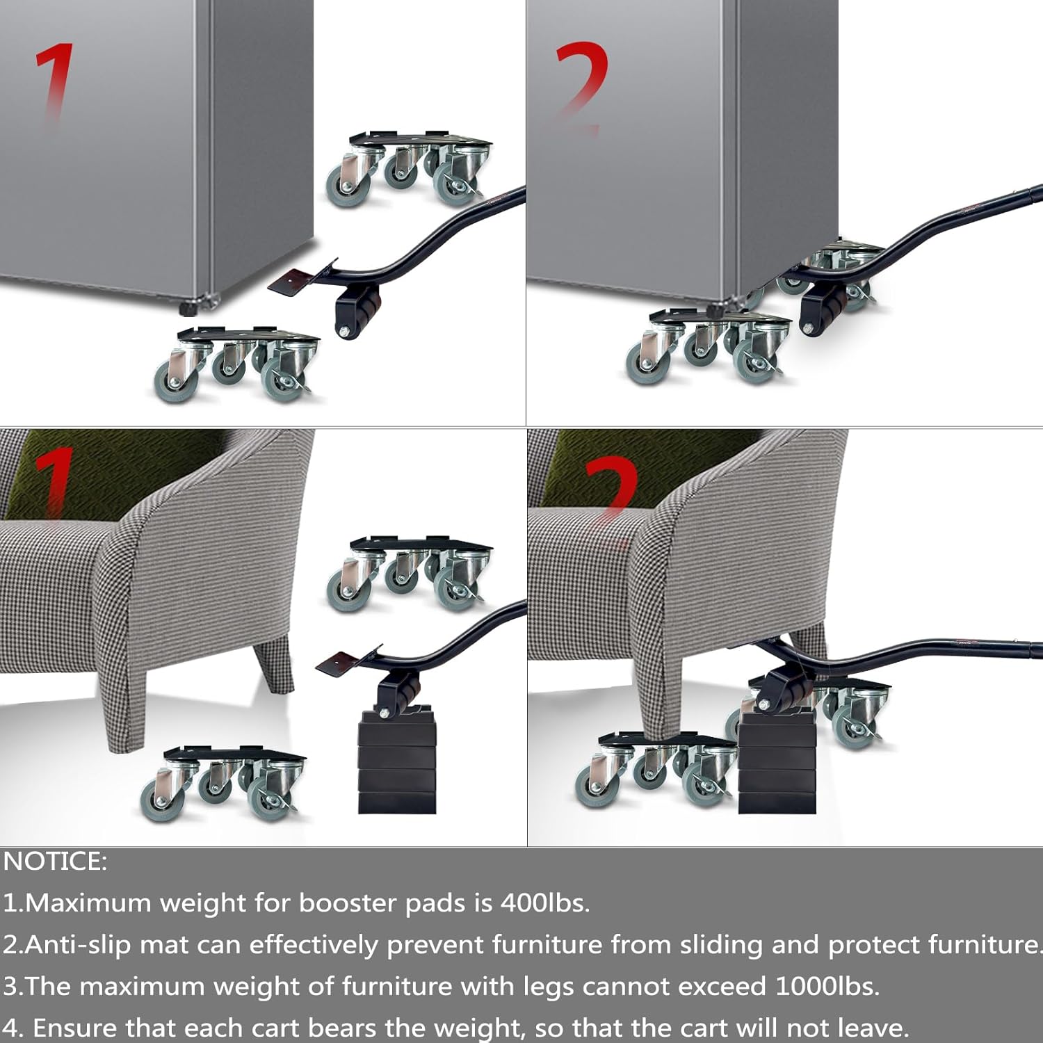 • Easy To Operate:Use the principle of leverage. You can easily lift one side of the furniture; then put the pulley under the foot of the furniture, if you need to raise the height can be put to raise the cushion,then put in the moving dolly on the bottom of the furniture,and lock the universal wheel,the four furniture moving wheels into the bottom of the furniture,and then open the universal wheel brake,without the help of others,you can easily move furniture and other heavy objects.