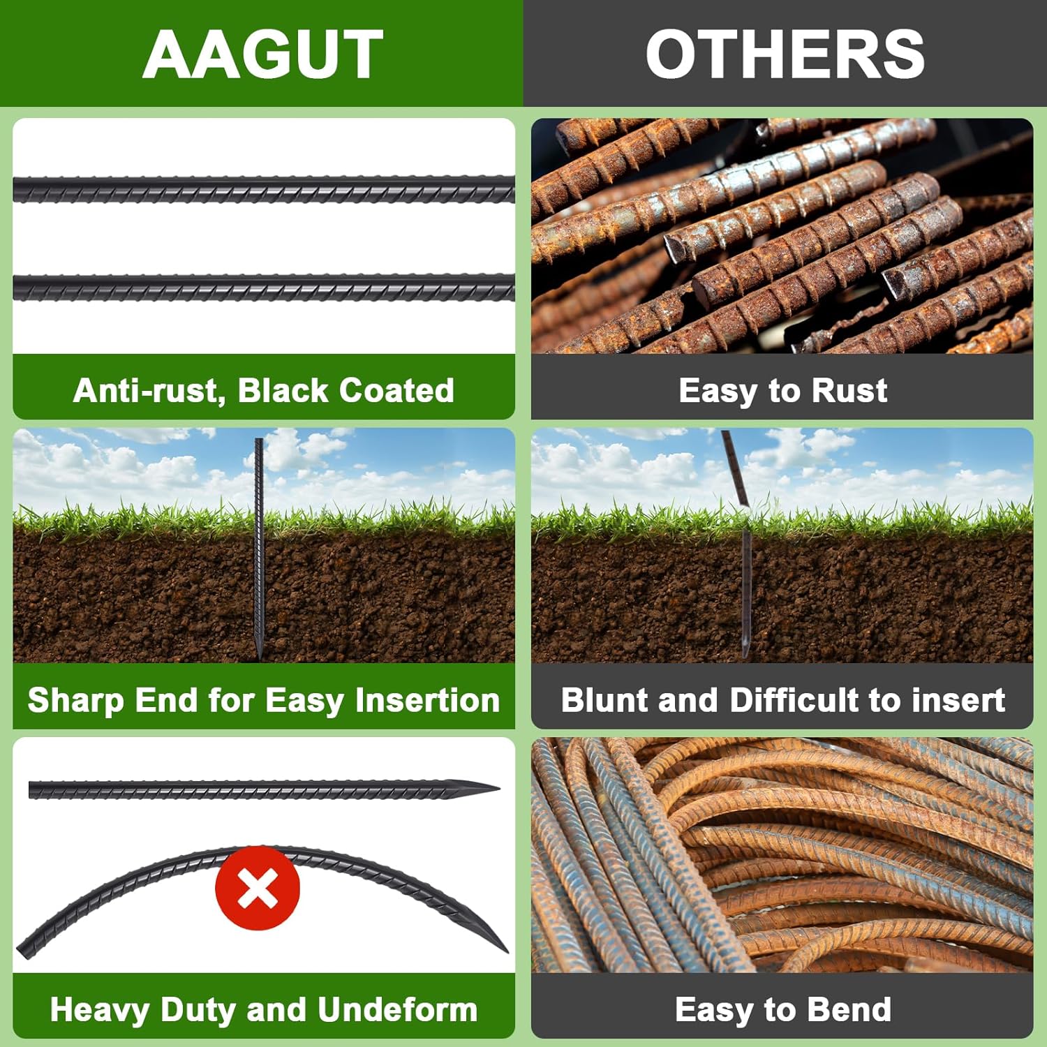 AAGUT Rebar Stakes 16 inch (34pcs) Heavy Duty 3/8” Ground Anchors Steel Garden Stakes Metal Straight Camping Tent Spikes with Chisel Point End for Hard Soil, Black Powder Coated