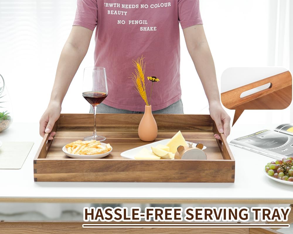 • 【EXTRA LARGE SQUARED WOOD TRAY】This giant wooden serving tray made from a sturdy acacia wood, durable, wipeable, food-safety, beautiful and functional. The big solid square-shaped tray is a good addition to your home.