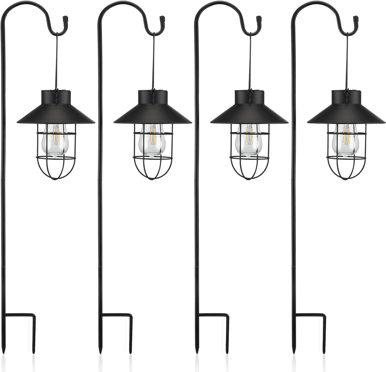 Retisee 4 Pcs Hanging Solar Light 31" Outdoor Solar Lamp Lanterns with Dual Use Shepherd Hook Waterproof Pathway Hanging Lights Metal Garden Lantern for Path Patio Yard Lawn Driveway Markers (Black)