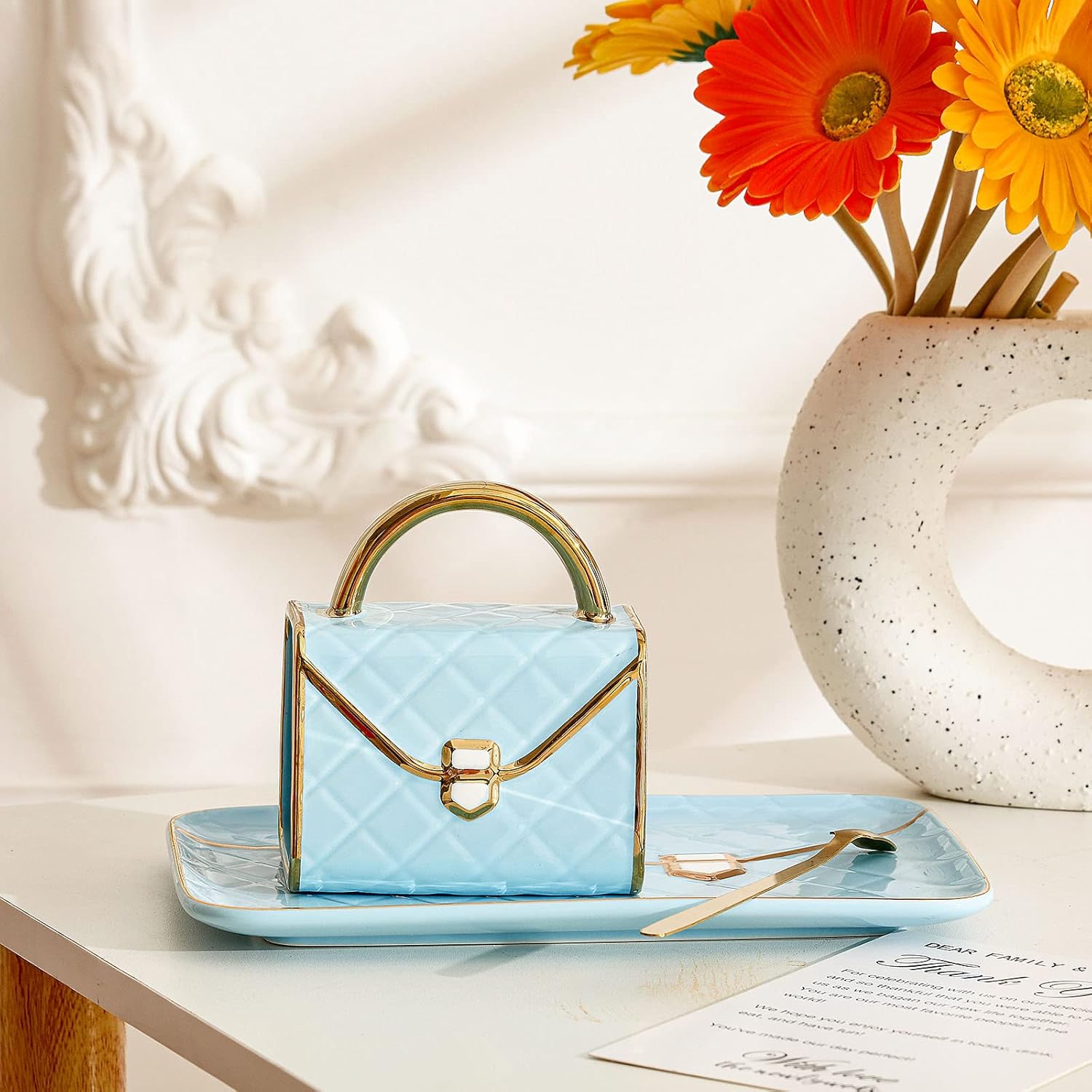 Zubebe 1 Set Coffee Mug Elegant Handbag Shaped Cup Modern Ceramic Purse Mug with Spoon and Saucer, 10oz Cute Creative Tea Cup for Office Home Woman Girls Gift (Blue)