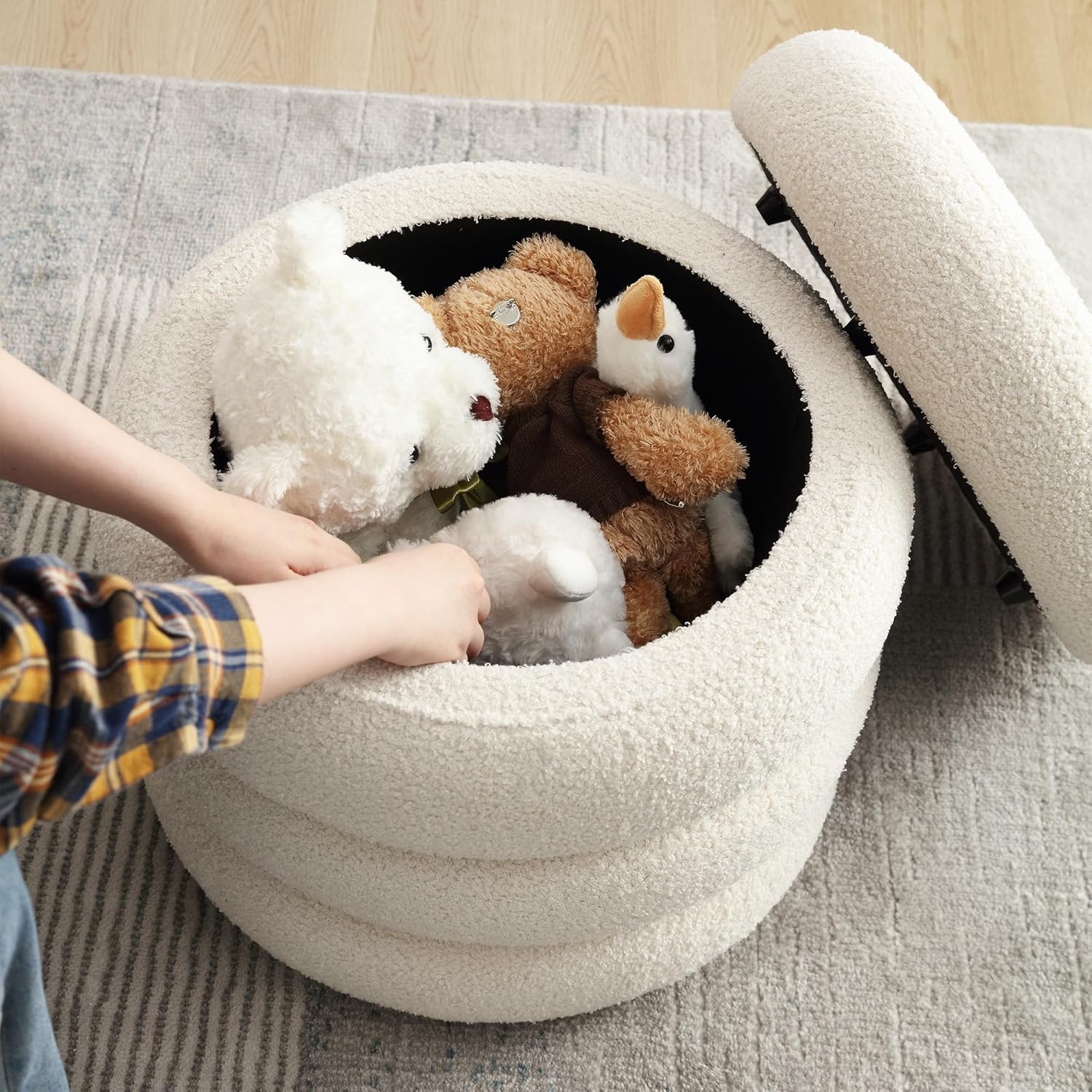 • [Enough Storage Space] A compelling layer of texture is added by the chic, soft boucle fabric, while the ribbed circular form creates a distinctive, modern design. Lifting the detachable lid reveals a storage area where you may arrange and organize all of your favorite things, including books, kid's toys, random objects, and more. You will have a tidy living area with room for all your pillows and blankets to be neatly stored inside.