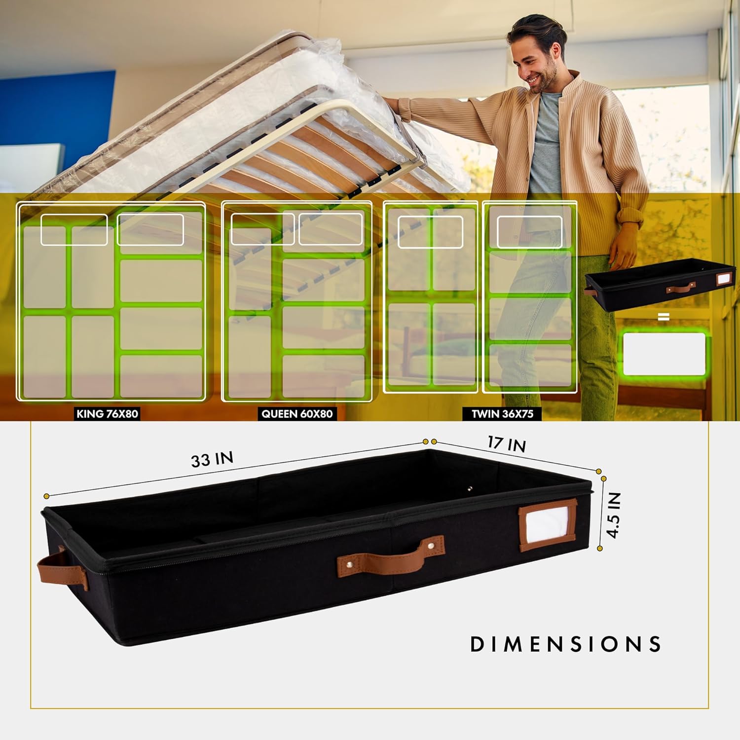 • ๐’๐ฎ๐ฉ๐ž๐ซ๐ข๐จ๐ซ ๐‚๐š๐ง๐ฏ๐š๐ฌ & ๐Œ๐š๐ญ๐ž๐ซ๐ข๐š๐ฅ: Made from premium quality canvas fabric, our 33x17x4.5" Plastic Under Bed Storage Containers With Lids are durable, sturdy, & carefully designed to hold large quantities of clothes, blankets, shoes, & various bed accessories. These low profile storage containers are designed to be an efficient bed room organization and storage. Our low profile under bed storage pack comes with under bed organizer that will easily blend into your home's aesthetic style.