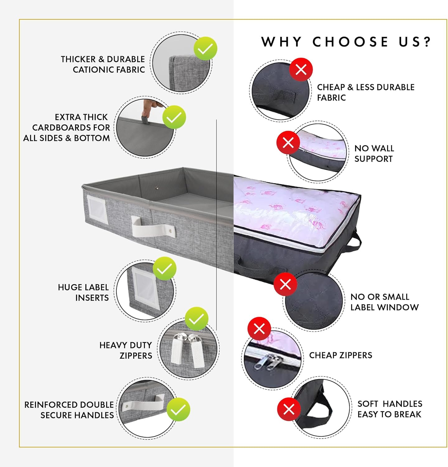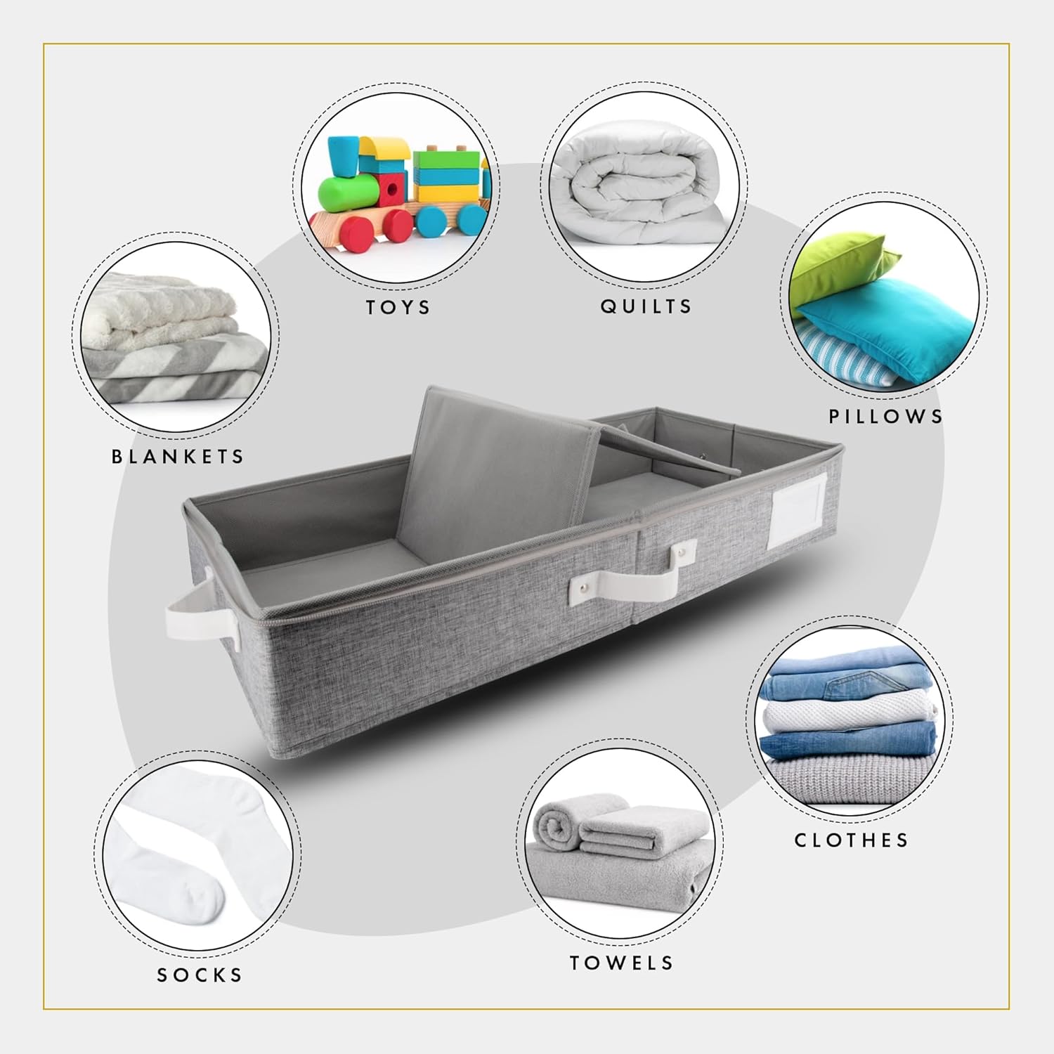 • 𝐇𝐞𝐚𝐯𝐲 𝐃𝐮𝐭𝐲 𝐙𝐢𝐩𝐩𝐞𝐫 𝐂𝐥𝐨𝐬𝐮𝐫𝐞: Committed to safety and organization, our under bed flat storage boxes are precisely tailored. The zipper of our storage containers for under the bed ensures that the items inside are protected from dust and other elements that can cause damage. Our under bed storage with lid are pusposely designed with durability and strength making it ideal for flat clothing storage that require frequent opening and closing, or those that carry heavy loads.