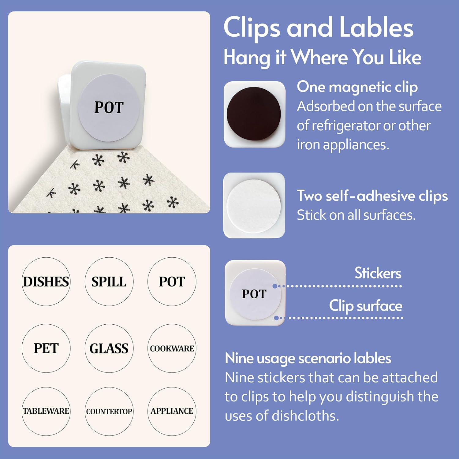 • Easy to Clean and Store: Our swedish dish cloths, measuring 7.8 x 6.8 inches, each set comes with 8 cellulose sponge cloths in 4 styles, along with 2 self-adhesive clips, 1 magnetic clip, and 9 labeling tags. Customize storage for easy access, hanging them on walls, counters, or refrigerators to keep your kitchen organized
