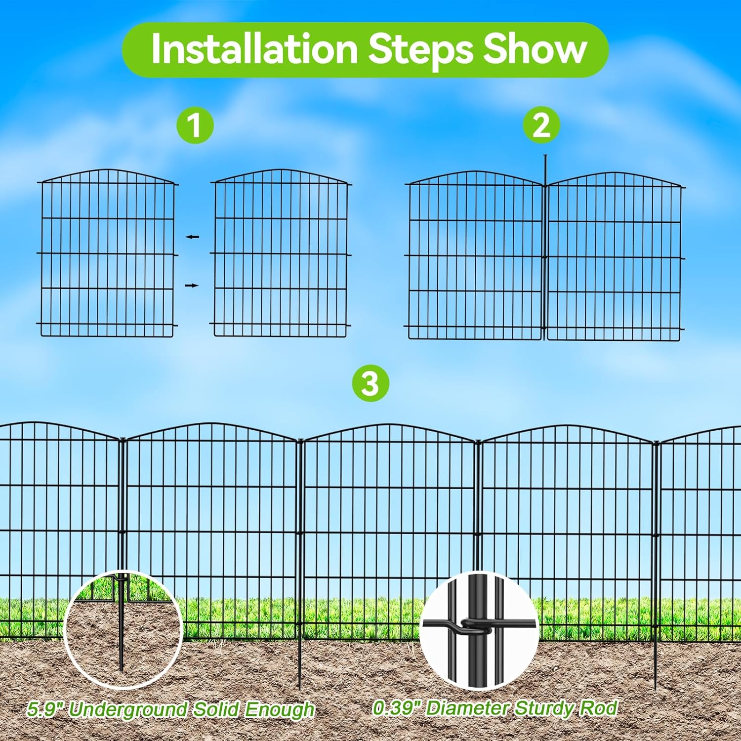 • Easy to Install:The dog fence for the yard are equipped with metal stakes, you only need to insert the metal stakes into the holes between the two fences, choose the installation location, and tap the metal stakes directly to install the outdoor fence. Easily create a beautiful garden fence without complicated installation process