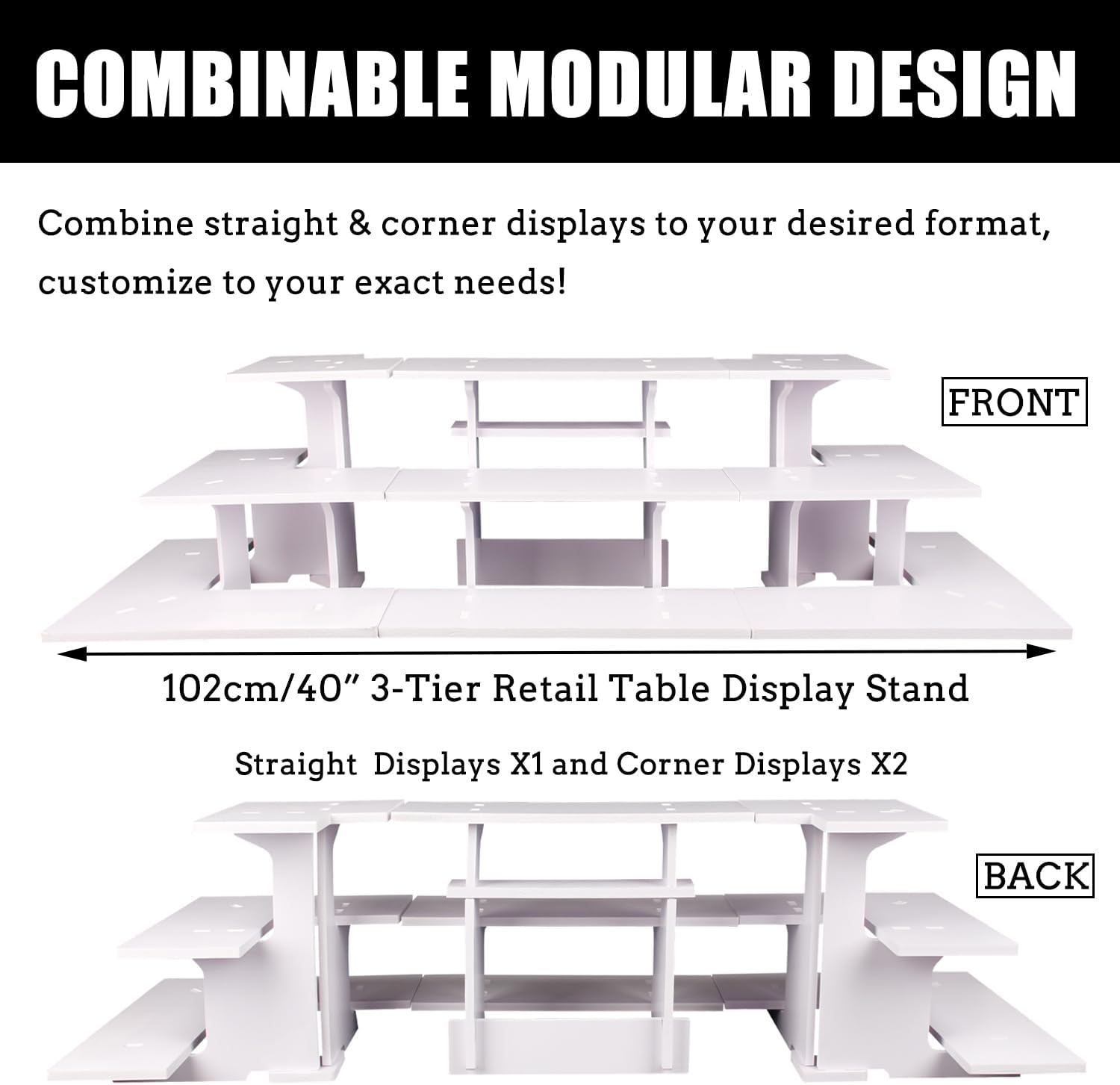• CUSTOMIZATION FRIENDLY: You can combine corner display and straight display to your desired format, customize to your exact needs this display stand! 1 set of straight display and 2 set of corner display can be combined into a set of 40 inch long 3 tier retail table risers display stands, perfect for farmers markets, craft fairs and pop up shop, vendor booth display items or office and home use!