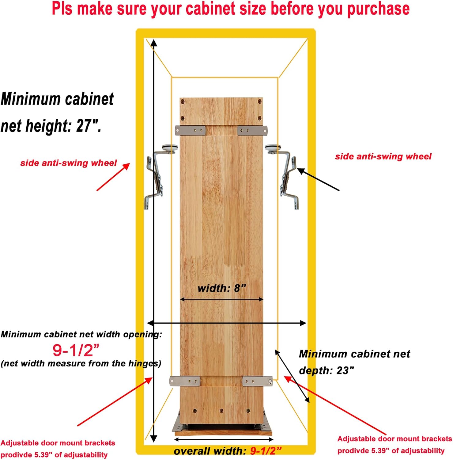 • ※ 【Large Storage Space】This spice rack organizer size is 8" W x 21.9" D x 25.2" H, the overall width included the sildes is 9-1/2" W, require at lest 9-1/2" W cabinet net width opening (net width measure from the hinge), Minimum cabinet net depth: 23"D This pull out spice rack each layer can hold at least 60 6oz spice jars / seasoning! Maximum save your space, keep your cabinets clean and tidy and stay away from clutter! The height of each tier is fixed.