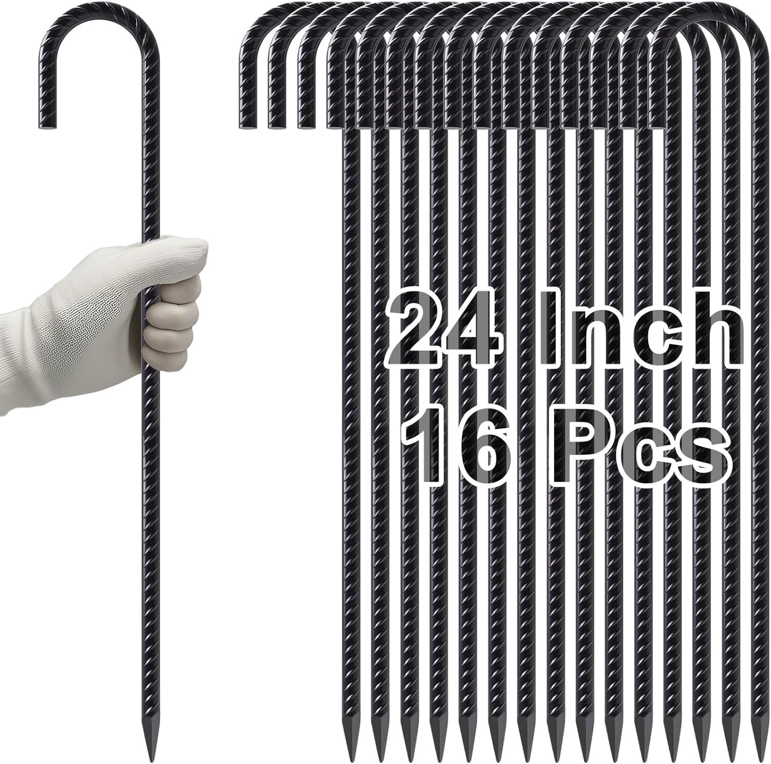 VVOKGO Rebar Stakes 24 Inch J Hook Heavy Duty Ground Anchors (16pcs), 3/8 Inch Diameter Metal Steel Extra Long Fence Stakes with Chisel Point End for Greenhouse, Gazebo, Carport, Camping Tents, Black