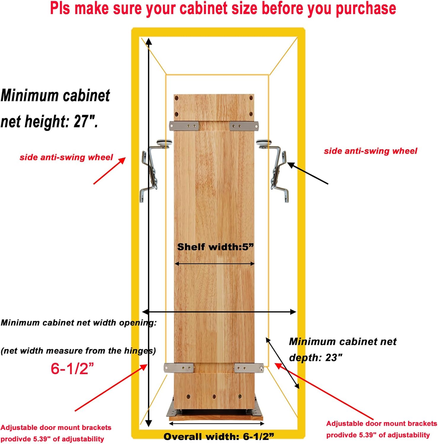 • ※ 【Large Storage Space】This spice rack organizer size is 5" W x 21.9" D x 25.2" H, the overall width included the sildes is 6-1/2" W , require at lest 6-1/2" W cabinet net width opening (net width measure from the hinge), Minimum cabinet net depth: 23"D. This pull out spice rack each layer can hold at least 14 jars spice / seasoning! Maximum save your space, keep your cabinets clean and tidy and stay away from clutter! The height of each tier is fixed.