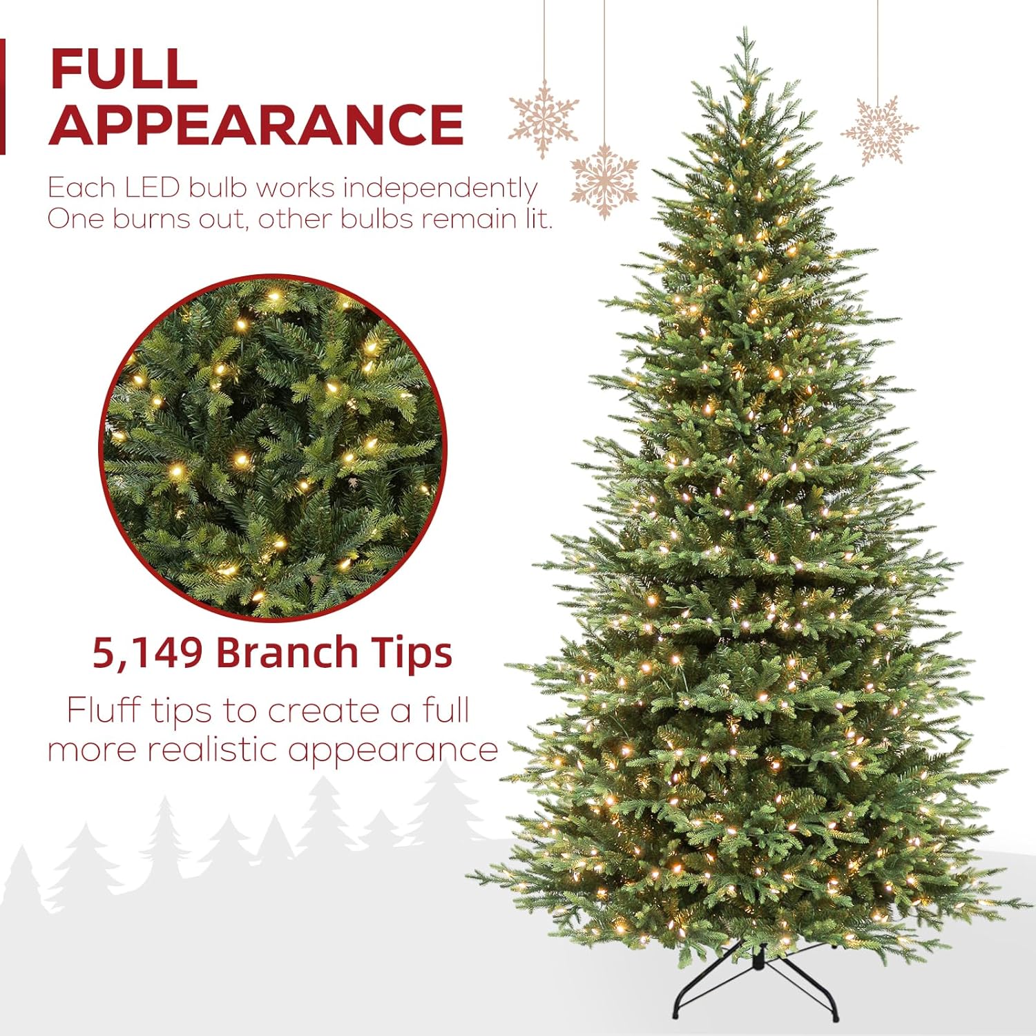 • 🌲NATURAL & LUSH LOOK: Measures 9 feet tall, 62 inches diameter at the base. Featuring a mixture of 5149 PE&PVC branch tips for remarkable realism, this christmas tree can be easily fluffed and shaped for a splendid and natural display. The Christmas tree also provides abundant space to showcase your favorite ornaments.