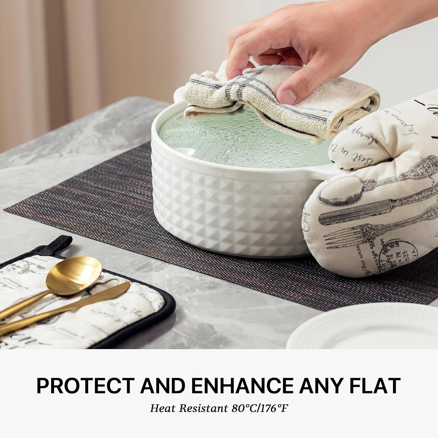 • EASY TO CLEAN:The washable placemats can be washed repeatedly.How to clean the place mats for kitchen table:Simply wipe with soap,water and a soft sponge or cloth.Scrub stubborn stains with a soft bristle-brush and a bleach-based cleanse.