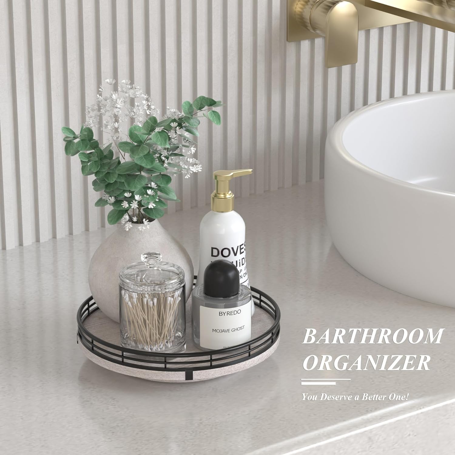9" Wooden Lazy Susan Organizer for Cabinet, Turntable Round Decorative Tray for Kitchen Sink, Countertop Organizer, Bathroom Counter Organizer for Skincare Makeup, Rustic White