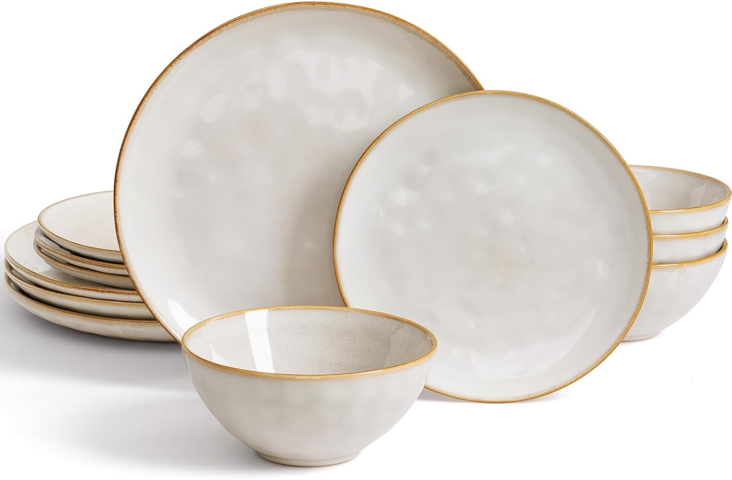 Famiware Dinnerware Sets for 4, Ocean Round 12-Piece Kitchen Plates and Bowls Sets, Reactive Glaze, Microwave and Dishwasher Safe, Scratch Resistant, Cappuccino White
