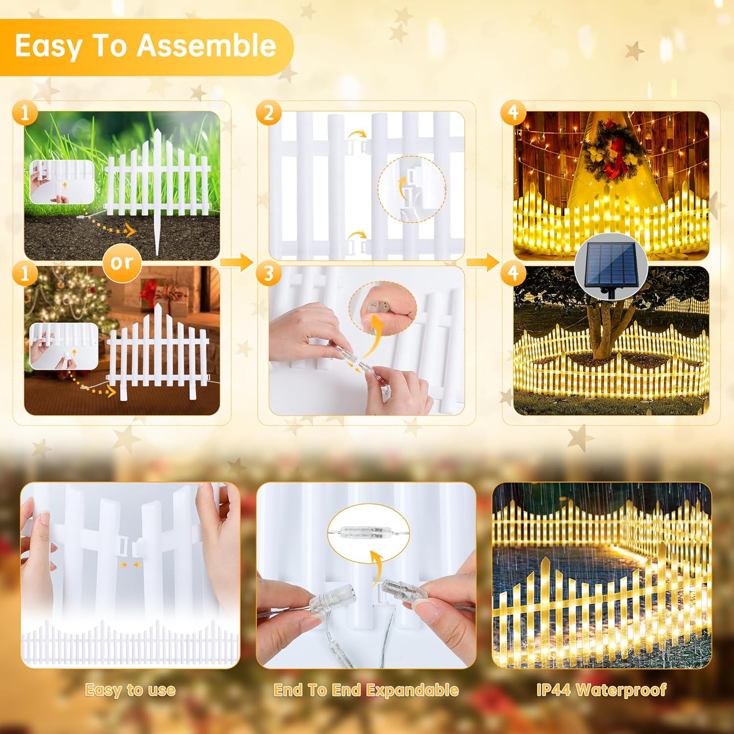• ✨【Easy Installation&DIY】There is end to end plug and snap-fit design on both sides of each panel,no need to dig or use tools,it is pretty convenient to assemble and disassemble.Flexible border pieces can be created into any shape or length you'd like.Enjoy the beautiful bright fence Christmas lights!