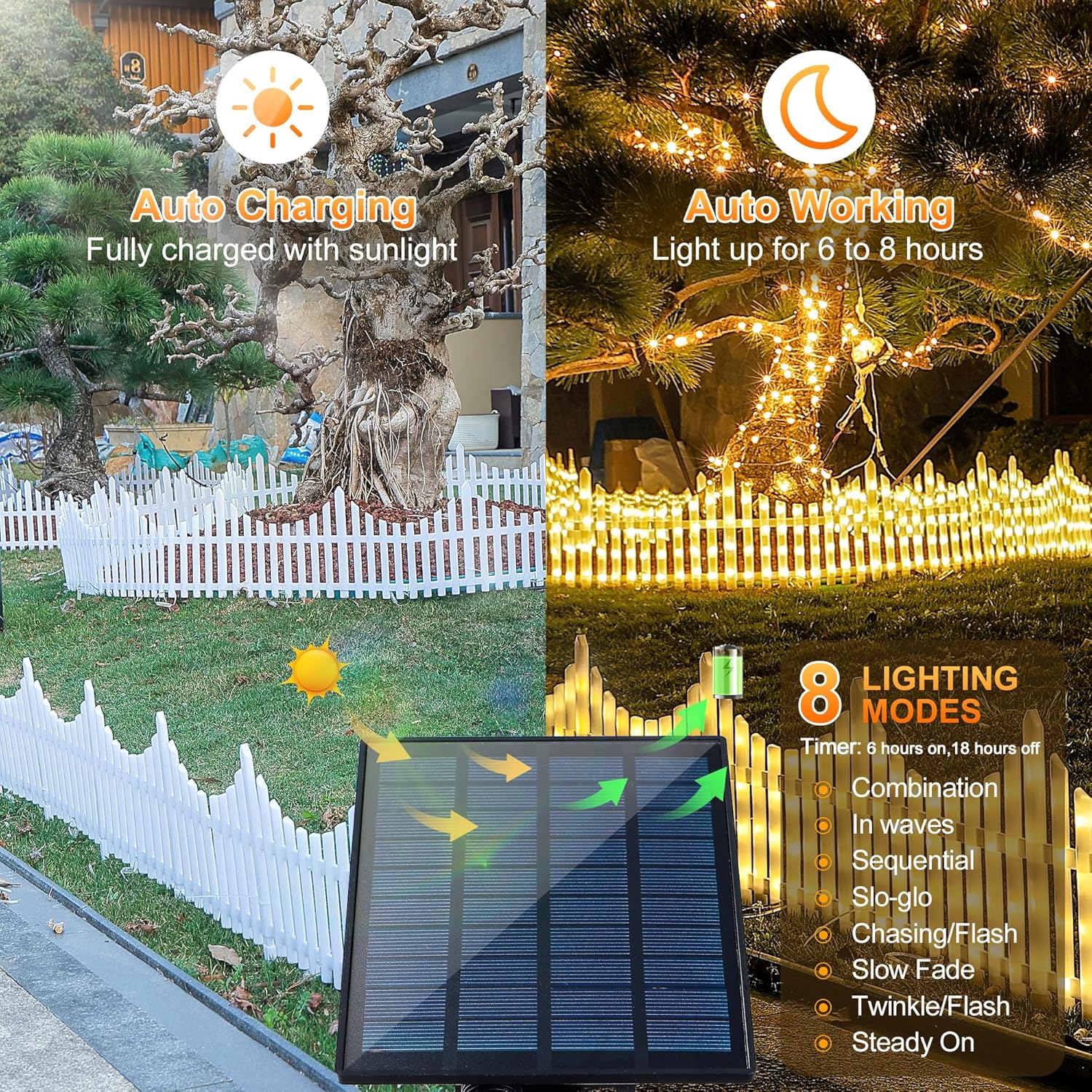 • ☔【8 Lighting Modes&Weatherproof】The Christmas tree fence solar lights can switch fantastic 8 lighting modes(combination,in wave,sequential,slo glo,chasing/flash,slow fade,twinkle/flash,and steady on) by the remote or the back of solar panel.And the outdoor decorative fence lights can withstand all kinds of weather all year round,it is very suitable for all kinds of holiday decorations in restaurants,hotels,clothing stores and flower shops.