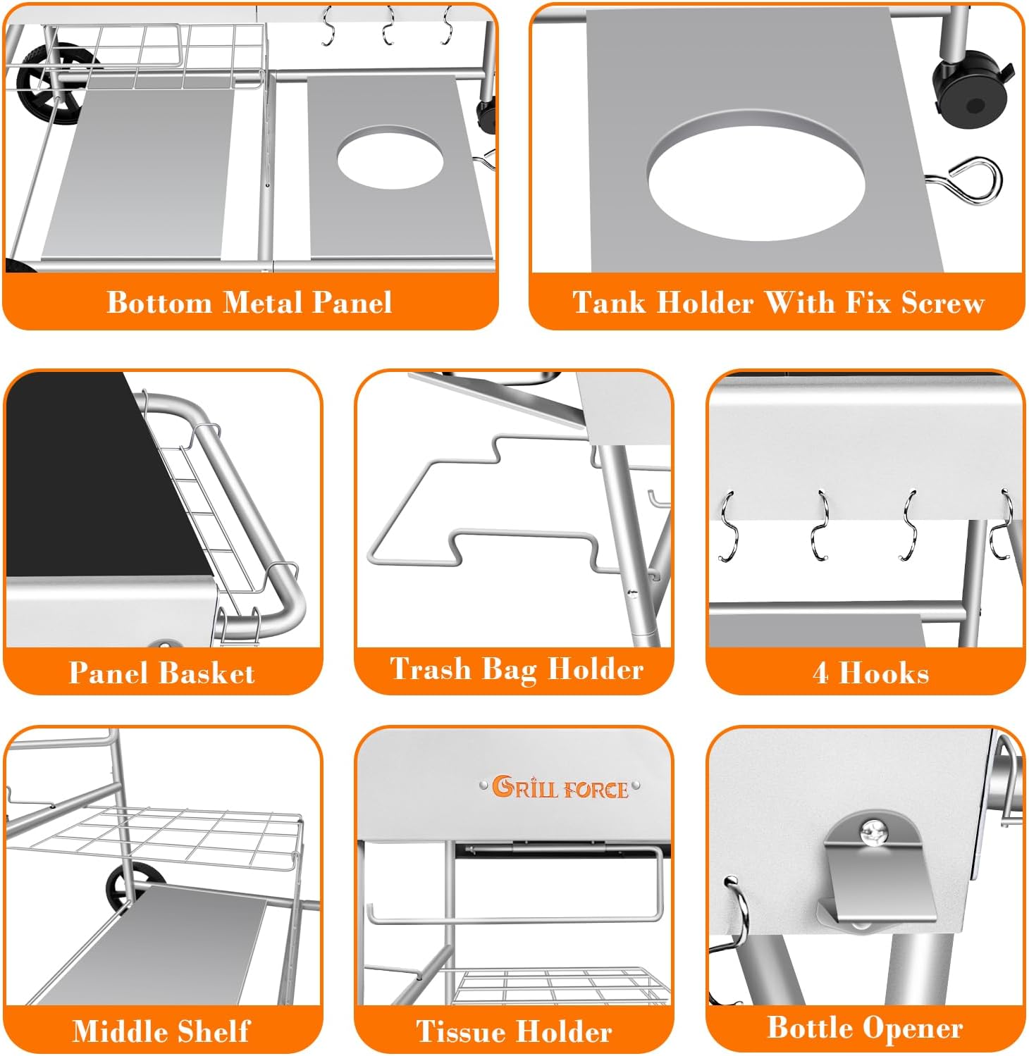• 【Additional Features for Convenience】The outdoor grill stand includes a condiment rack to keep sauces and toppings organized, four S-hooks for hanging tongs, brushes, and pizza peels, and a trash bag holder for easy waste disposal. It also features a paper towel holder and a bottle opener, ensuring everything stays neat and accessible, creating a professional cooking experience.