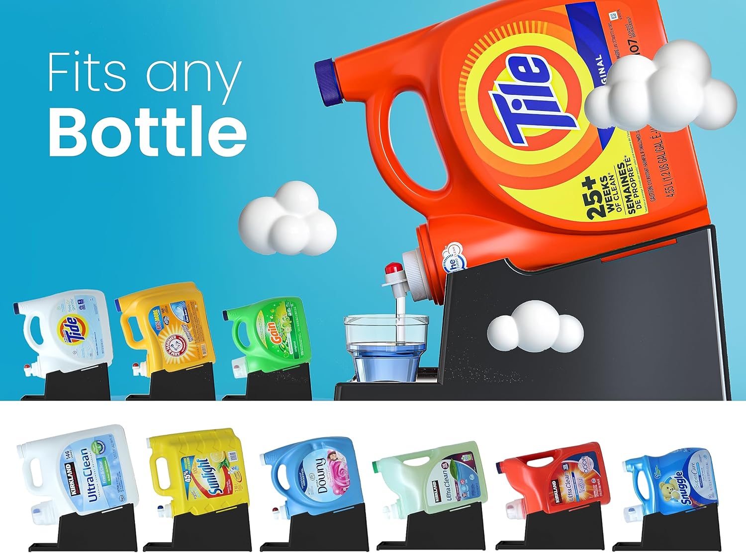 • [Versatile Fit:] The liquid laundry detergent holder station's optimal size (7.9"L x 12.2"W x 5.5"H) accommodates various bottle sizes, providing a perfect fit for most detergent containers without taking up too much space. (Laundry Soap, Cup, and Bottles NOT Included)
