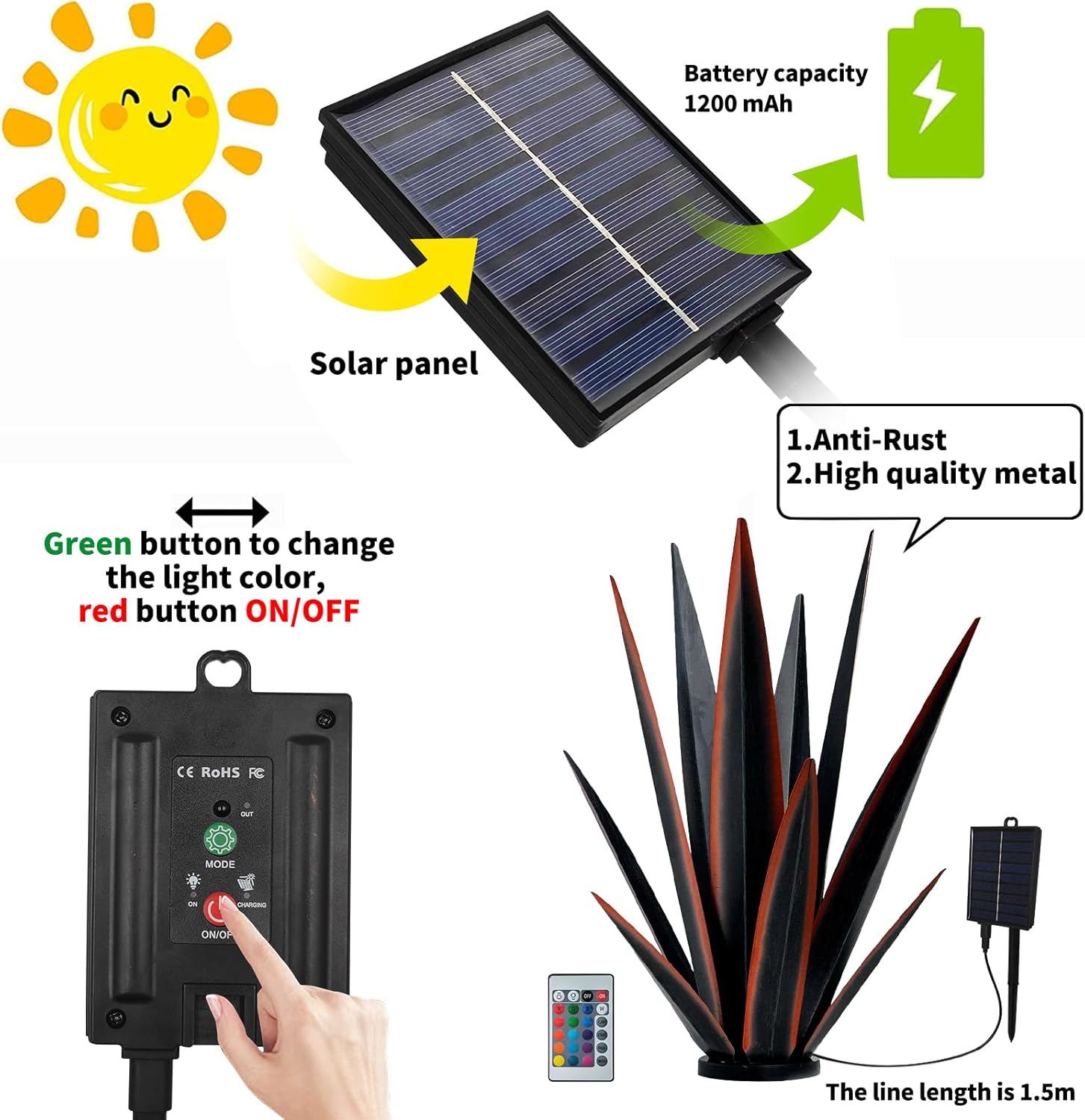 Large Tequila Rustic Sculpture, Rustic Metal Agave Plants for Outdoor Patio Yard, Home Decor Hand Painted Metal Agave Garden Yard Statue, Outdoor Lawn Ornaments (Red - L (W/Solar Light))