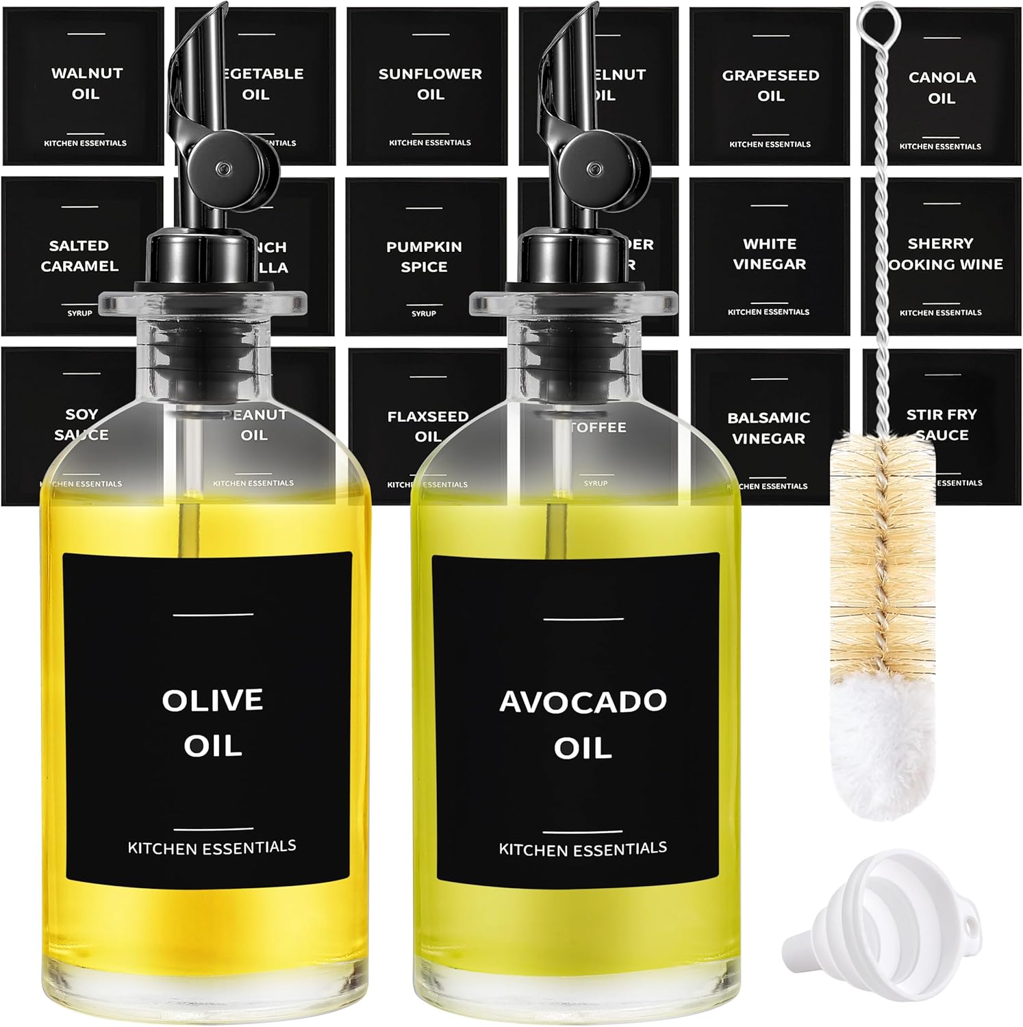 Olive Oil Dispenser Bottle - Includes 55 Kitchen Essential Labels - Cooking Oil Bottles for Kitchen, Coffee Syrup Dispenser - Pourer Spout with 11.8 fl oz Glass Container Cruet - 2pcs, Black