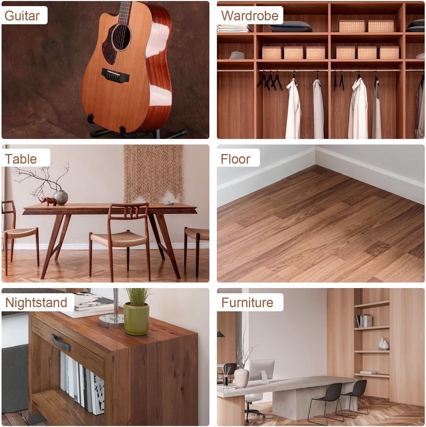 • This wood furniture repair kit includes:1 wood putty,1 plastic scraper,1 brush,1 gloves and 1 sandpaper.Our wood filler putty can repair cracks,gouges and damage,cover graffiti and stain,fill holes.Walnut wood putty delicate scrub resistant,repairing damaged wood easily and without traces,giving your wood long time protection.